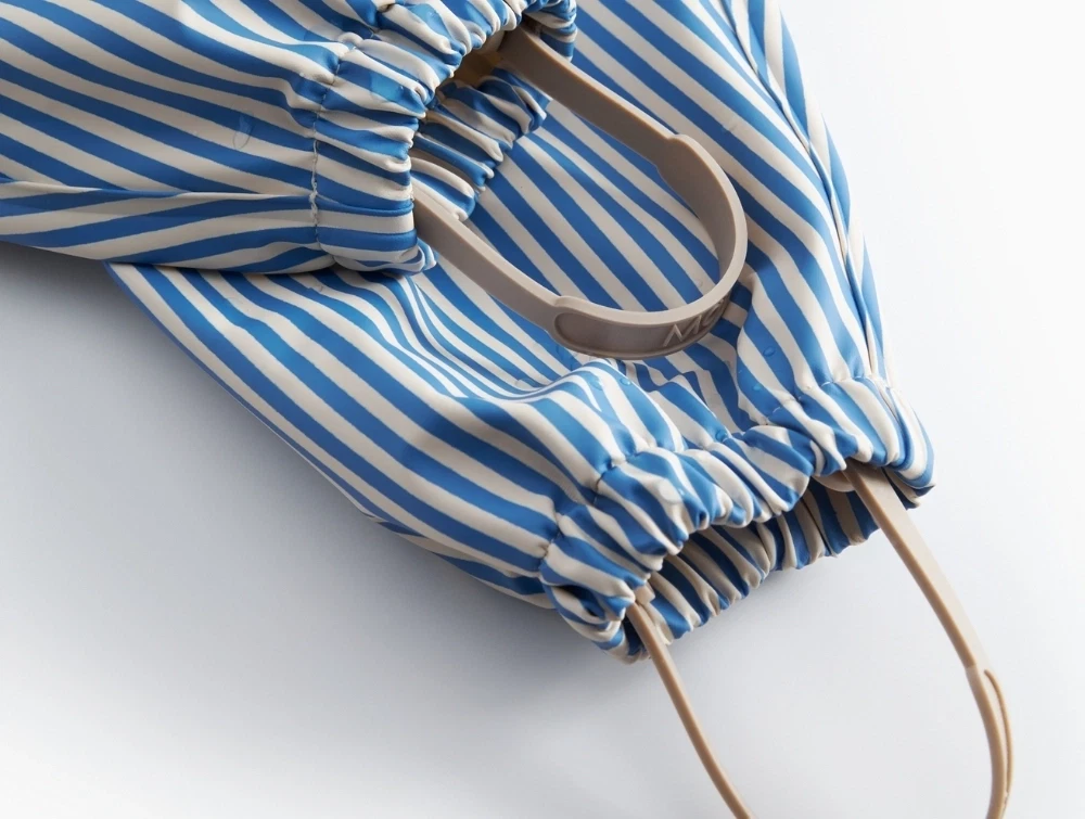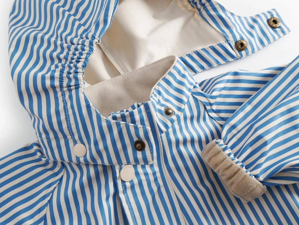 Dragten har et klassisk, roligt udtryk med fine striber og er designet til at holde de mindste tørre på regnfulde dage. Pasformen er almindelig og giver god bevægelsesfrihed.