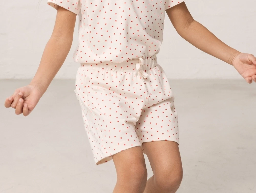 MarMar shorts i modal med happy hearts printpige iklædt MarMar shorts med små hjerter i råhvid nuanceMarMar børneshorts i modal med hjerteprint og bindebåndMarMar shorts med små hjerter i råhvid nuance og baglomme med logo labelMarMar shorts set bagfra med happy hearts print