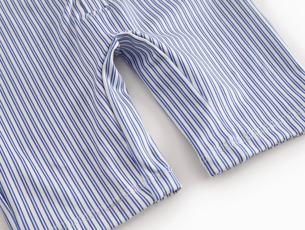 Dreng iklædt MarMar baby badedragt med blå striberMarMar baby badedragt med blå striberMarMar baby badedragt med striber og lynlåsMarMar baby badedragt med korte benMarMar baby badedragt set bagfra med blå striber