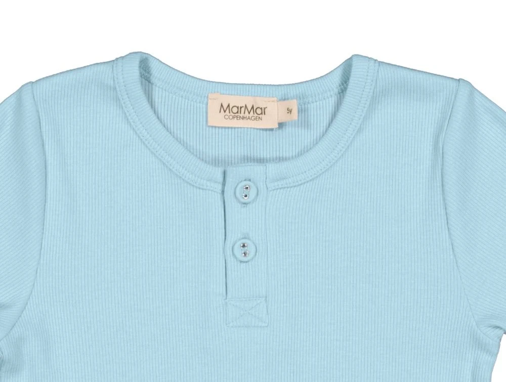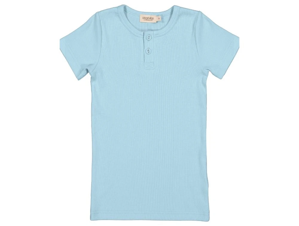 Lyseblå kortærmet basis t-shirt med stolpelukning fra MarMAr copenhagen 252-115-31 heavenly blueStolpelukning med to knapper i lyseblå kortærmet basis t-shirt fra MarMAr copenhagen 252-115-31 heavenly blue