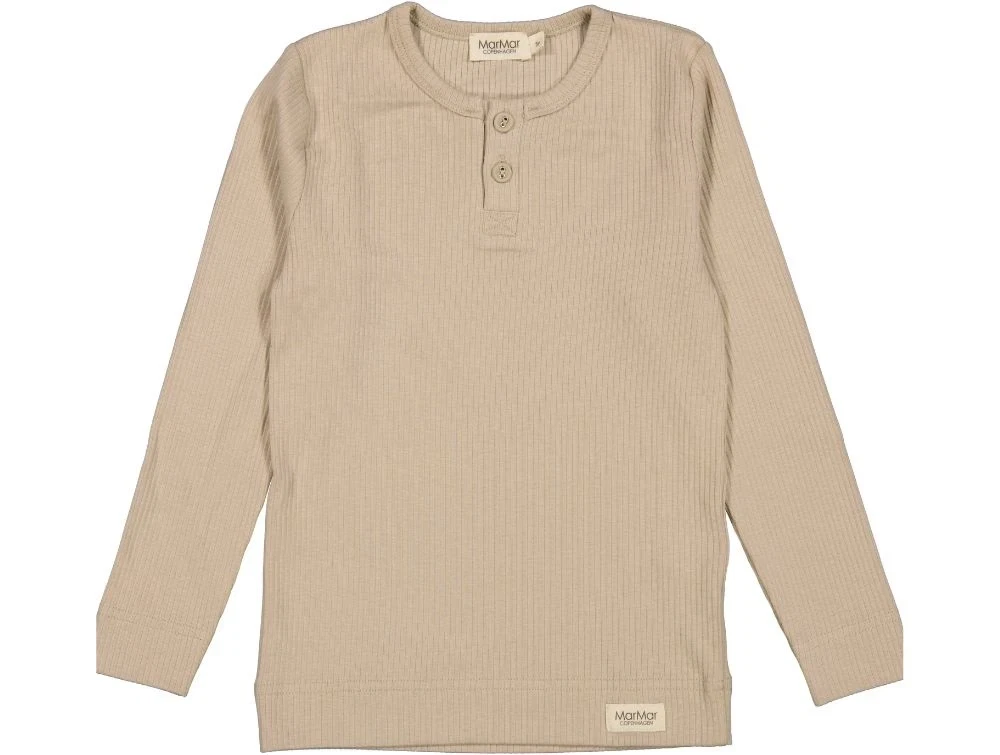 Langærmet t-shirt med stolpe knaplukning fra MarMar Copenhagen i en enkel og klassisk ribstrikket modalblanding. T-shirten er blød, strækbar og behagelig at have på.