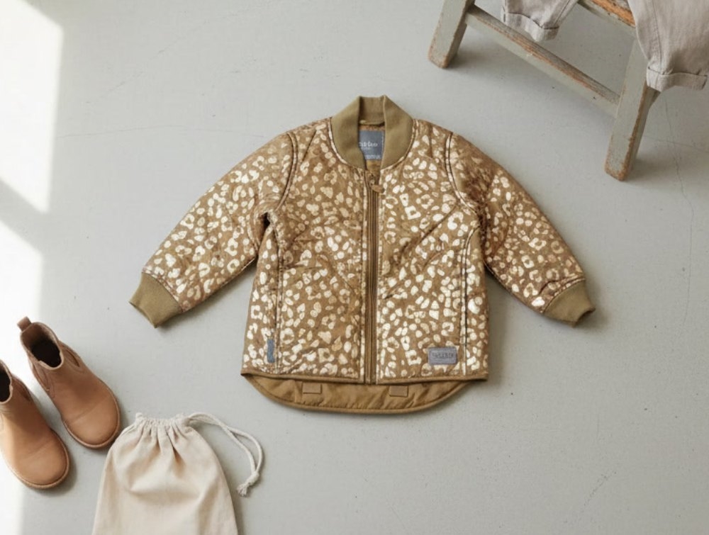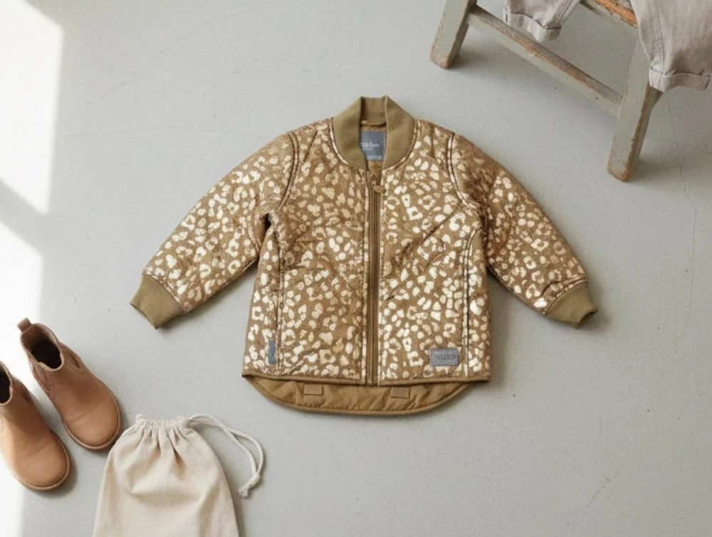 Termojakke i farven dark mustard med metallic leo-print fra MarMar Copenhagen.