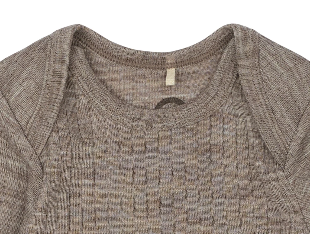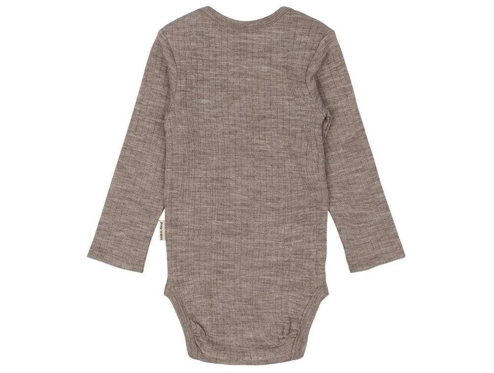 Body i brun meleret nuance fra Mikk-Line i 100% merinould. Modellen har lange ærmer, kuvertlukning i halsen og trykknapper mellem benene.