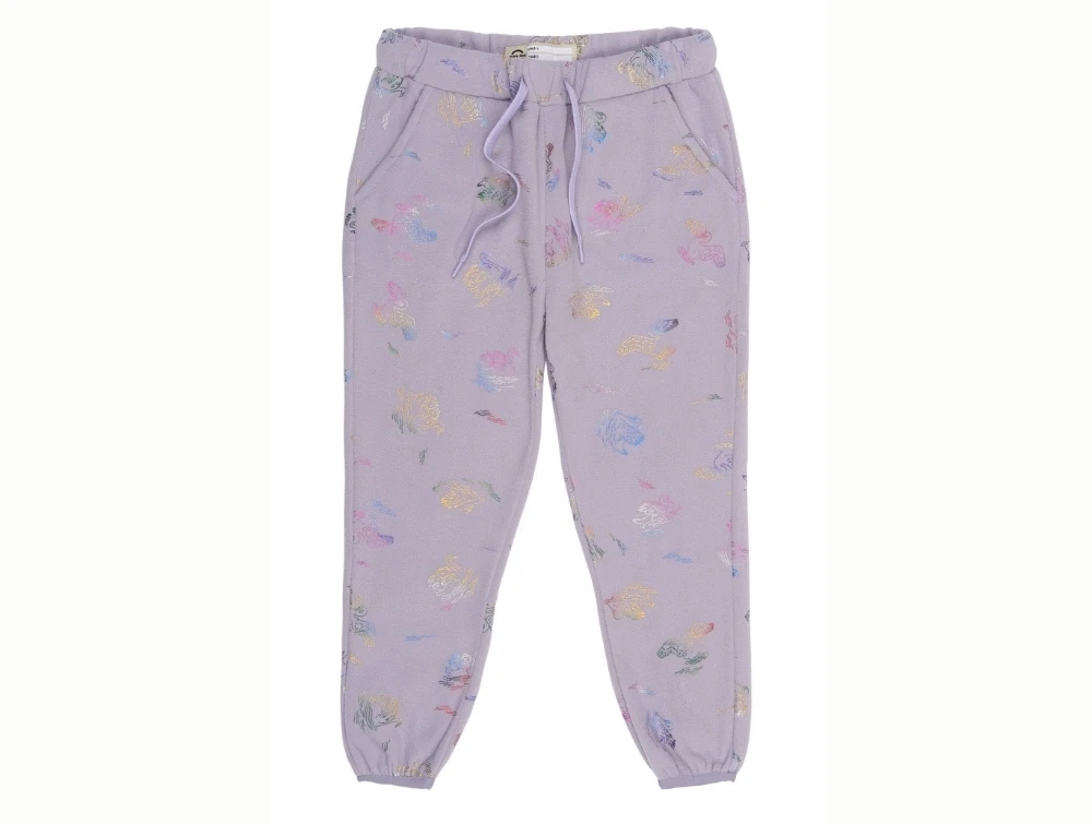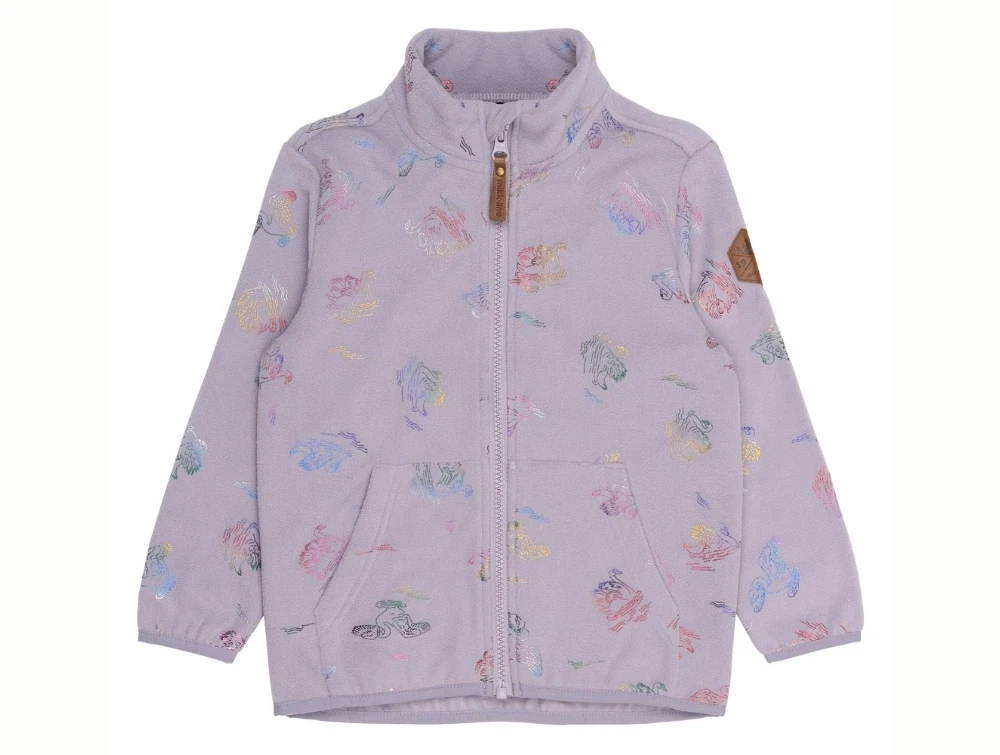 Sættet består af lilla fleecejakke og bukser med glitrende svaneprint i regnbuefarver. Et blødt og praktisk sæt, der kan bruges både sammen og hver for sig – som varm mellemlag under regntøj eller flyverdragt, eller som let overtøj på tørre dage.