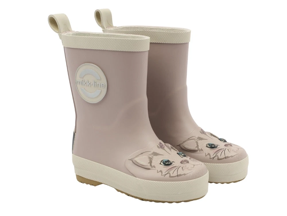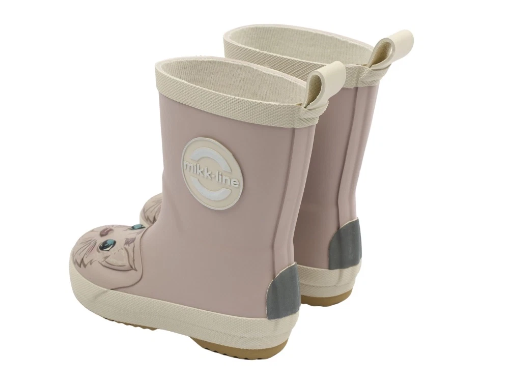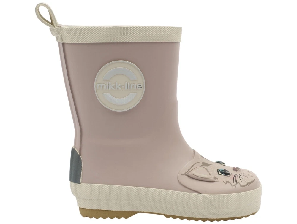 Mikk-Line gummistøvler i rosa nuance med medium pasform og afrundet snude. Modellen har et dekorativt 3D kattemotiv på snuden med fine detaljer, som giver et sødt og sjovt udtryk for børnene. Støvlerne er lavet i gummi og har refleksdetaljer, der gør dem velegnede til våde dage i børnehaven, på legepladsen og på tur.
