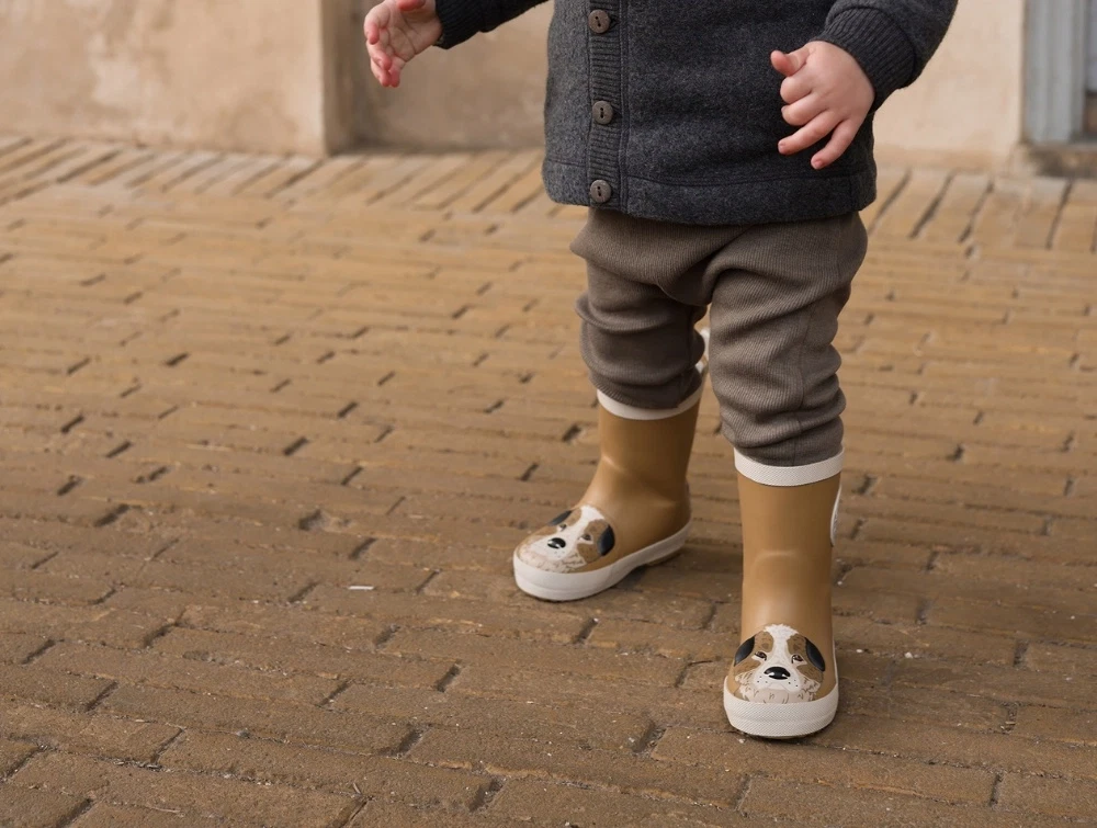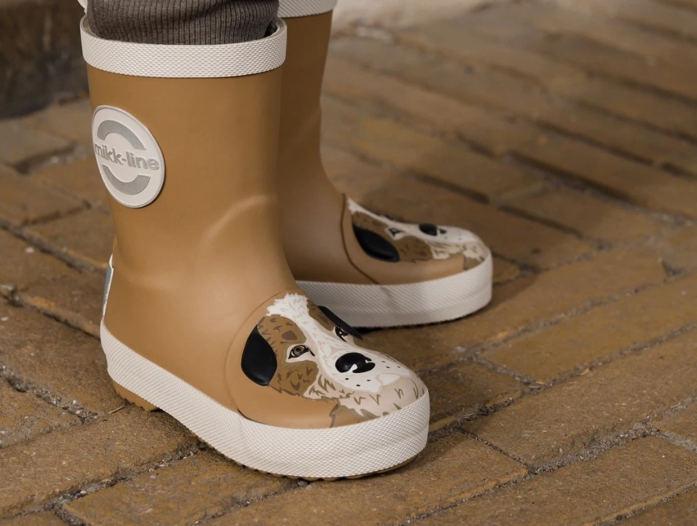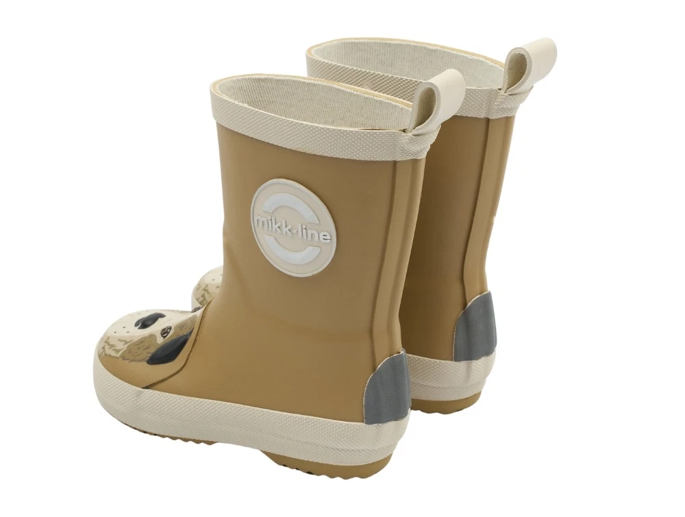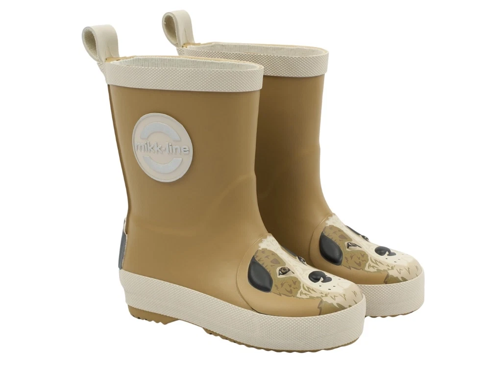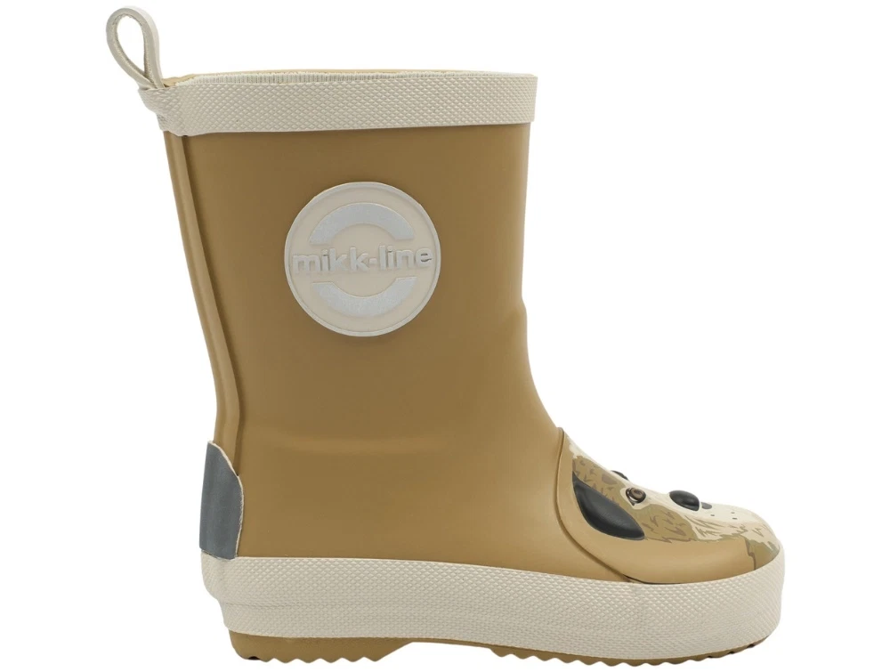 Mikk-Line gummistøvler i brun nuance (dijon) med medium pasform og afrundet snude. Modellen har et dekorativt 3D hundemotiv på snuden, som giver et sjovt og genkendeligt udtryk. Støvlerne er lavet i gummi og har refleksdetaljer, der gør dem velegnede til våde dage i børnehaven, på legepladsen og på tur.