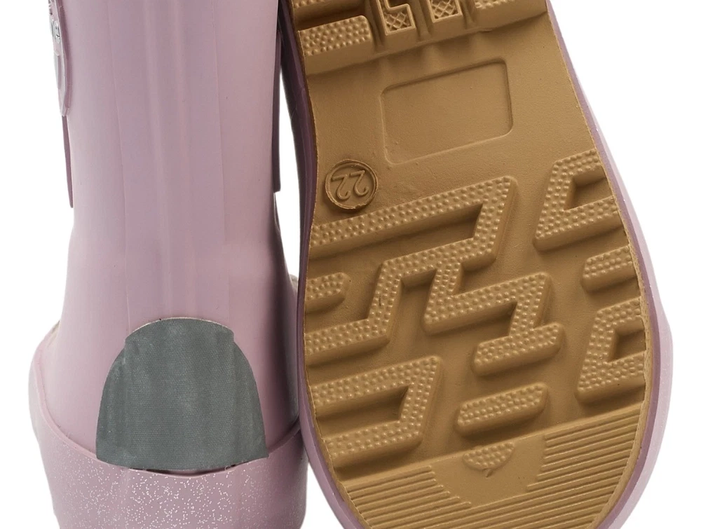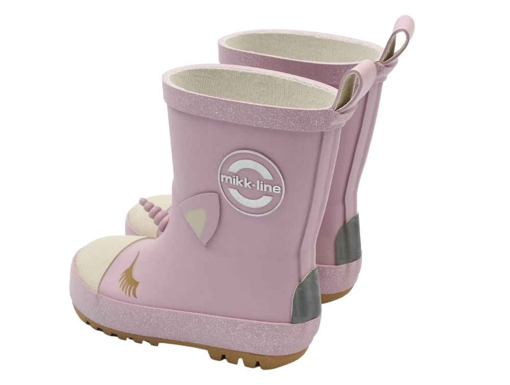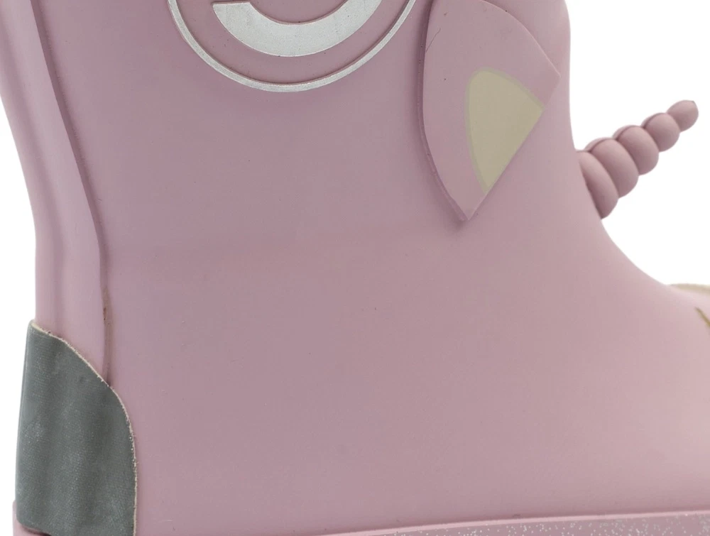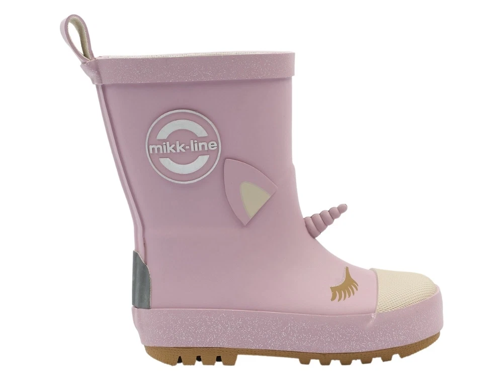 Mikk-Line gummistøvler i rosa nuance (mauve shadows). Modellen har fine 3D-detaljer med enhjørning, horn og små elementer, som giver et sjovt og fint udtryk. Støvlerne er lavet i naturgummi og har refleksdetaljer, der gør dem velegnede til våde dage i børnehaven, på legepladsen og på tur.