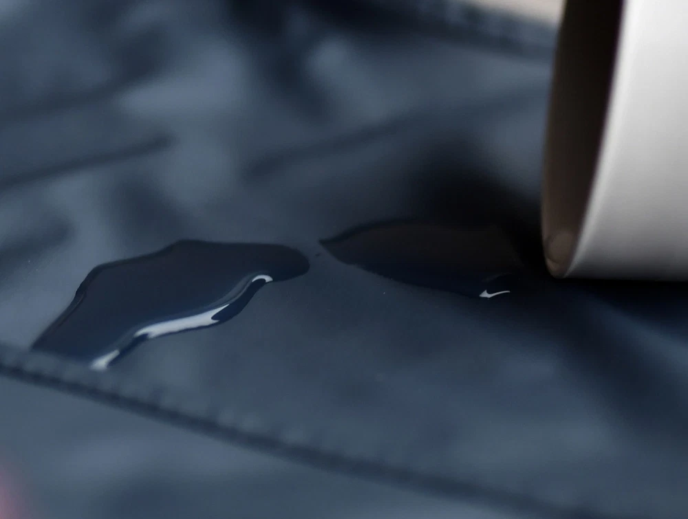 Kort hagesmæk i blue nights fra Mikk-Line. Fremstillet i blød og vandtæt PU med genanvendt polyester og OEKO-TEX® certificering.