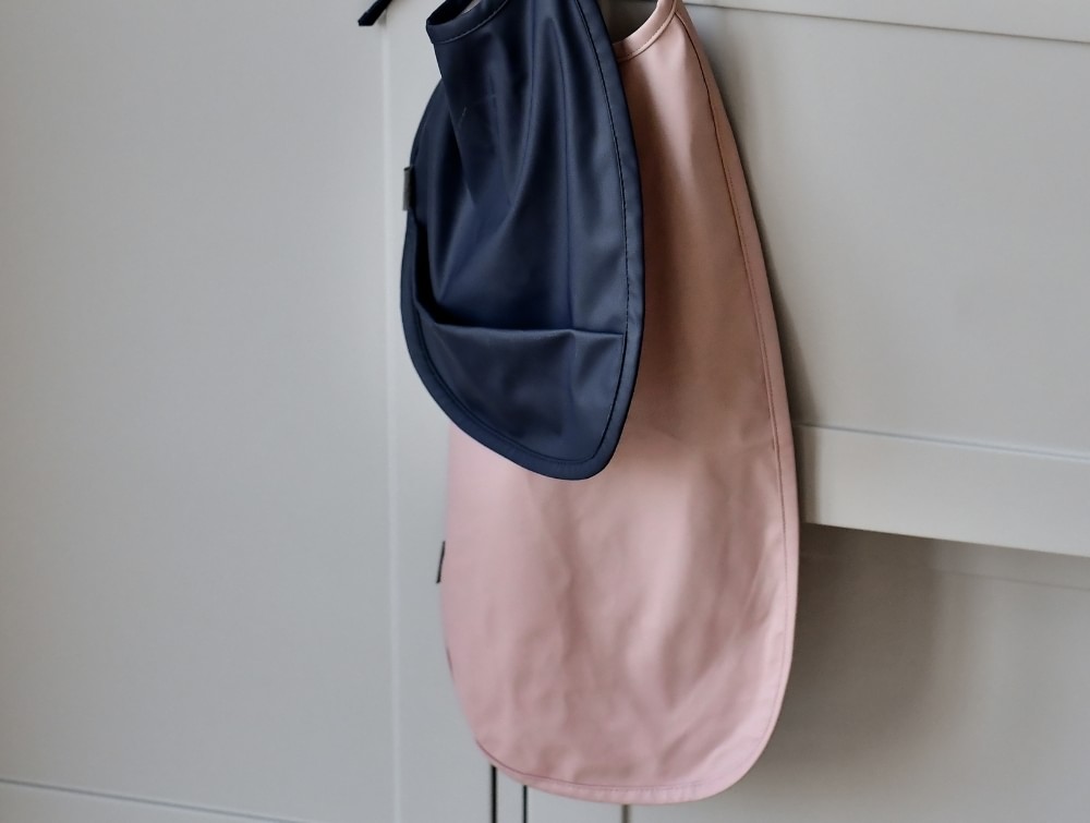 Kort hagesmæk fra Mikk-Line i blue nights farveNærbillede af vandafvisende overflade på Mikk-Line hagesmæk i blue nightsMikk-Line hagesmække i blue nights og adobe rose hængende