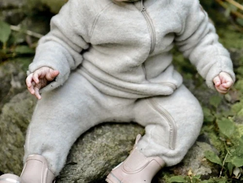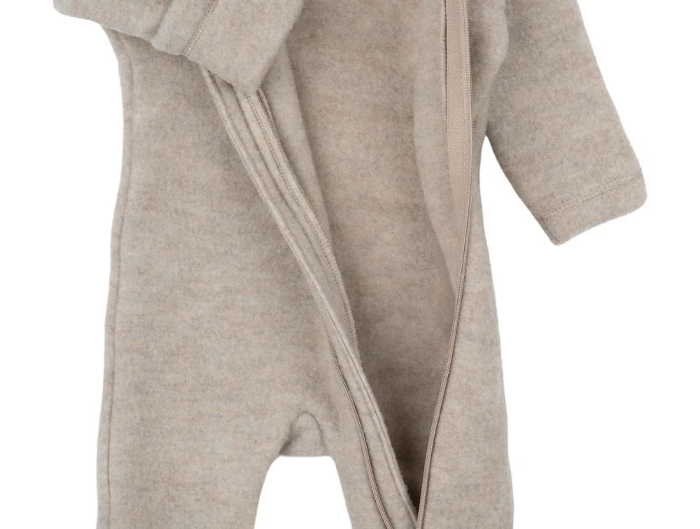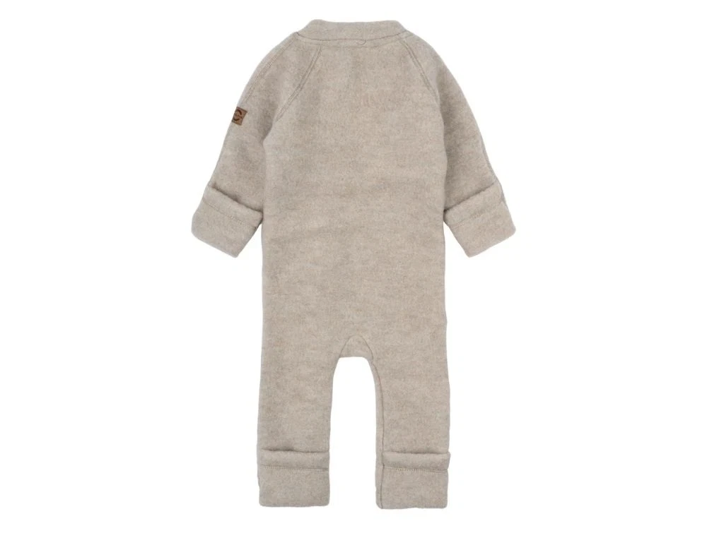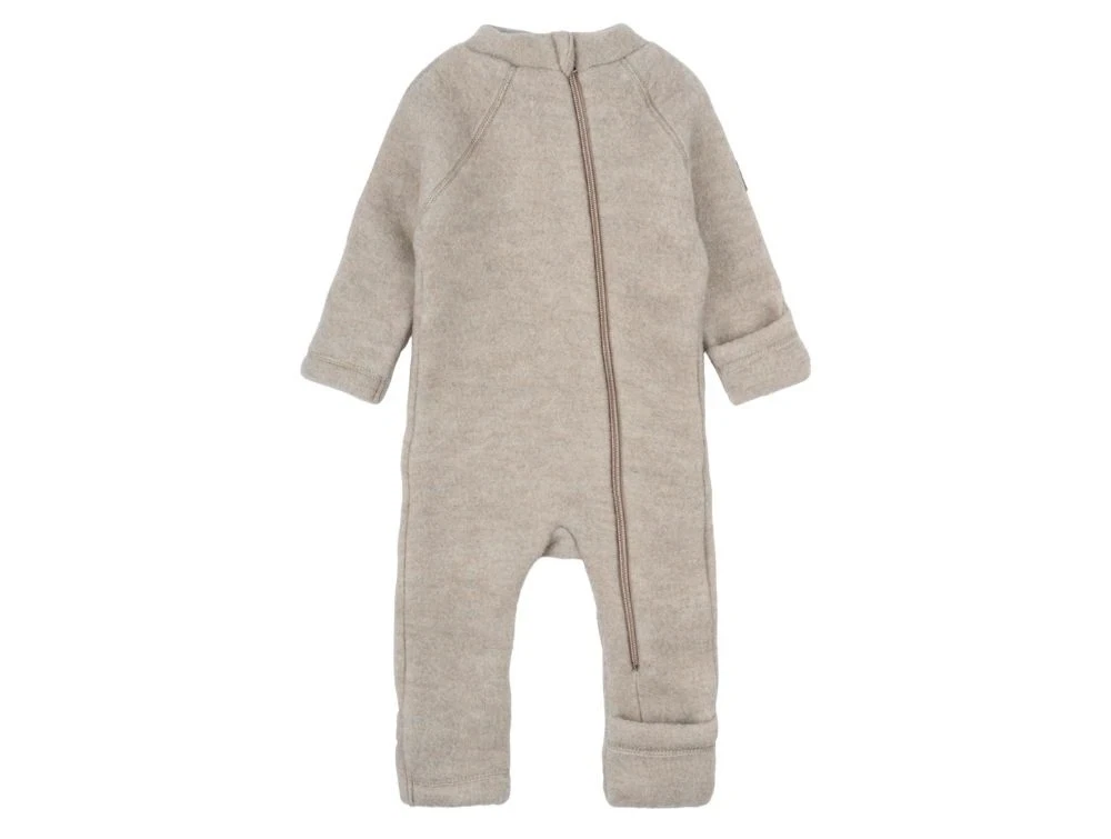 Ulddragt i børstet merinould farven melange offwhite fra Mikk-line. Dragten har en lang, nikkelfri YKK-lynlås med hagebeskyttelse og vendbare manchetter, der ved ombuk kan dække hænder og fødder for ekstra varme. Certificeret efter OEKO-TEX® Standard 100, hvilket sikrer, at den er uden skadelige kemikalier. God som både yderlag eller mellemlag alt efter vejret.