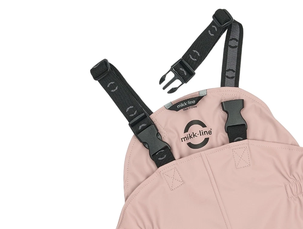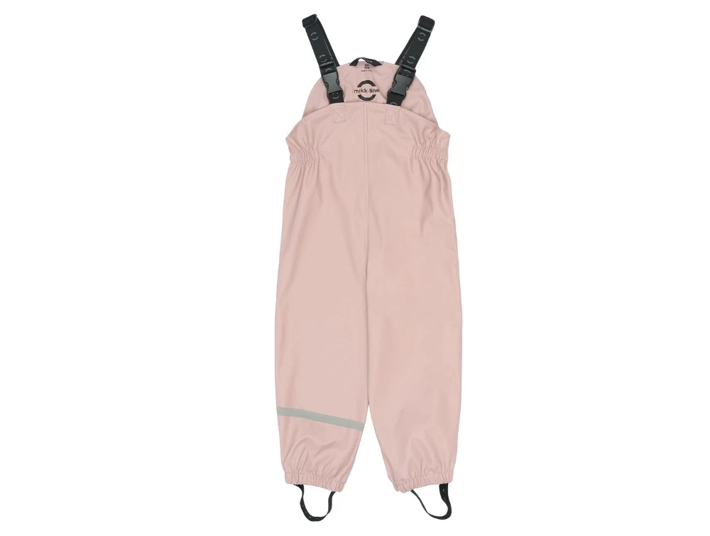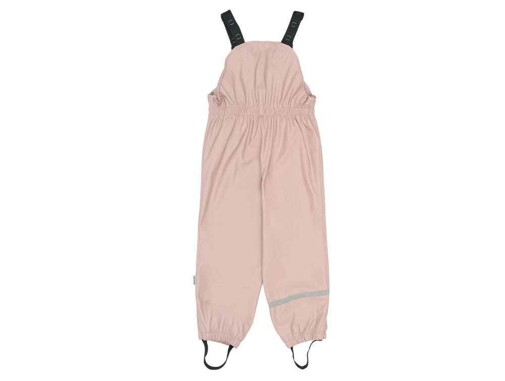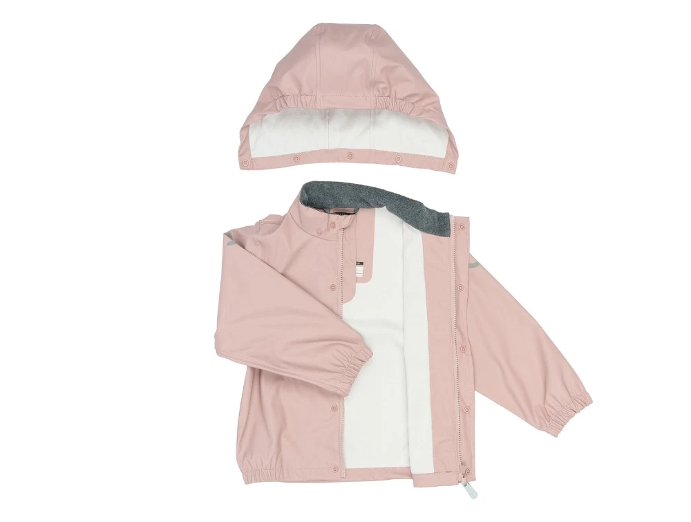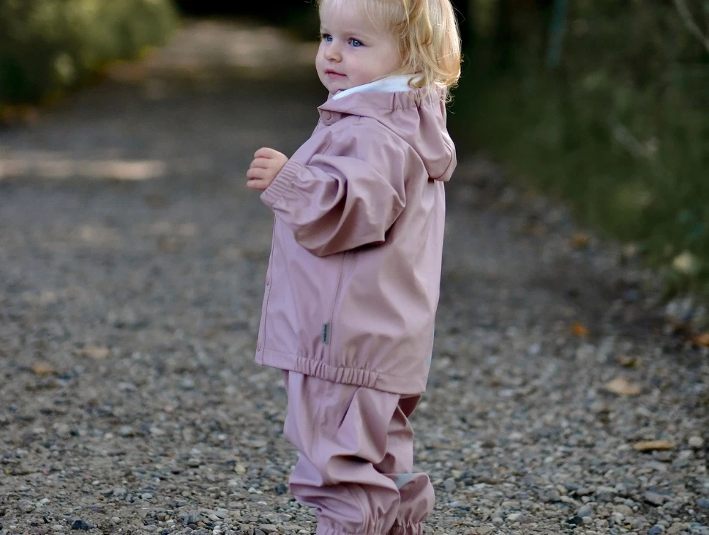 Regnsæt i rosa nuance (adobe rose) fra Mikk-Line med seler, refleksdetaljer og aftagelig hætte. Sættet består af jakke og overalls og passer godt til små børn, som skal holde sig tørre på regnvejrsdage.
