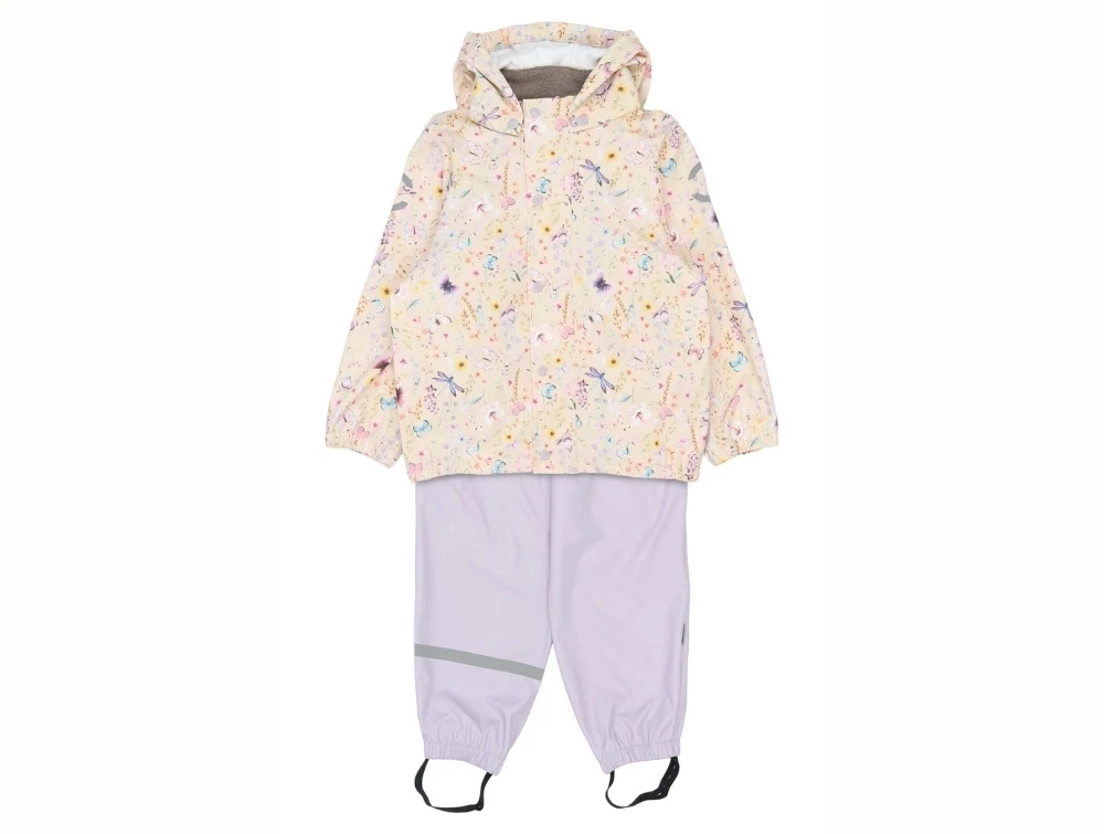 Regnsæt i sart beige nuance med sommerfugleprint (butterfly aop) fra Mikk-line.