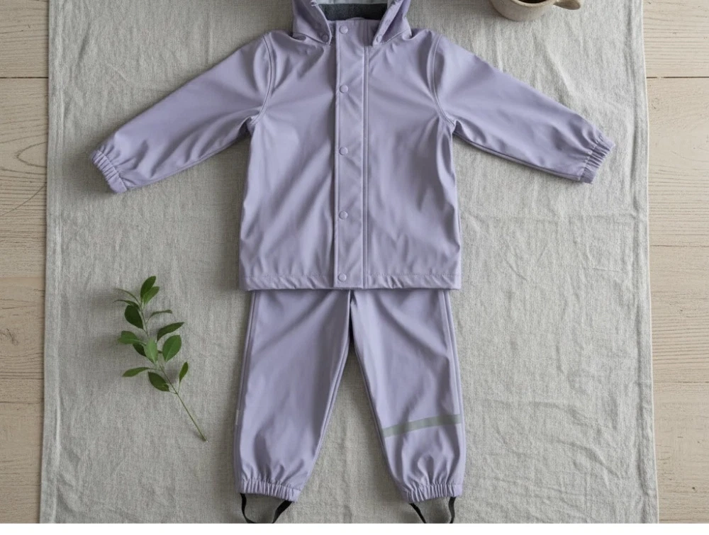 Sættet består af regnjakke og regnbukser med justerbare seler, fremstillet i slidstærkt og vandtæt PU-materiale med svejsede sømme og blød fleece i kraven.