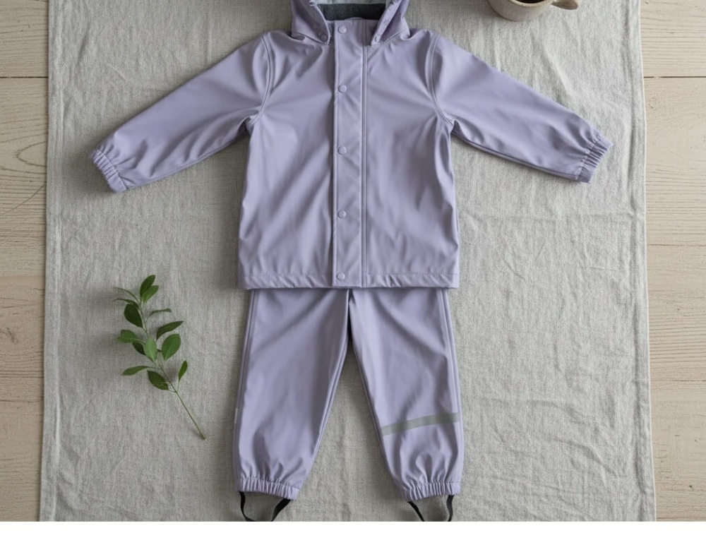 Regnsæt i lys lilla (dusk) fra Mikk-Line med seler og praktiske funktioner.