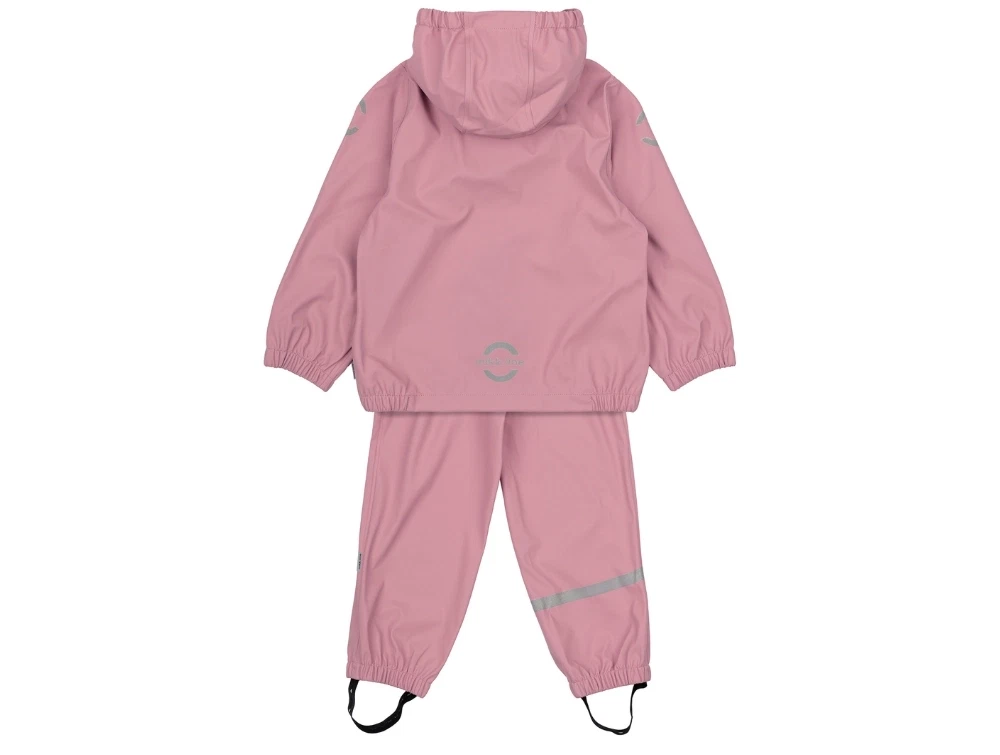 Mikk-Line regnsæt i lyserød nuance med seler. Regnsættet er lavet i et vandtæt materiale og designet til aktive børn, der elsker at lege ude i regnvejr og hoppe i vandpytter.