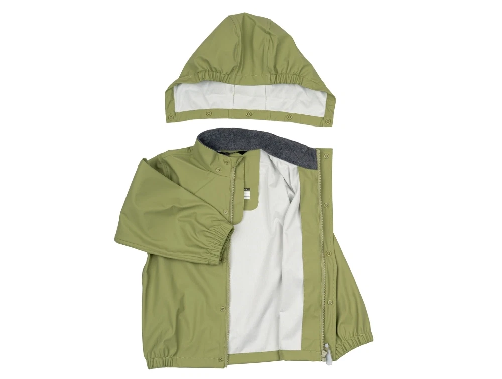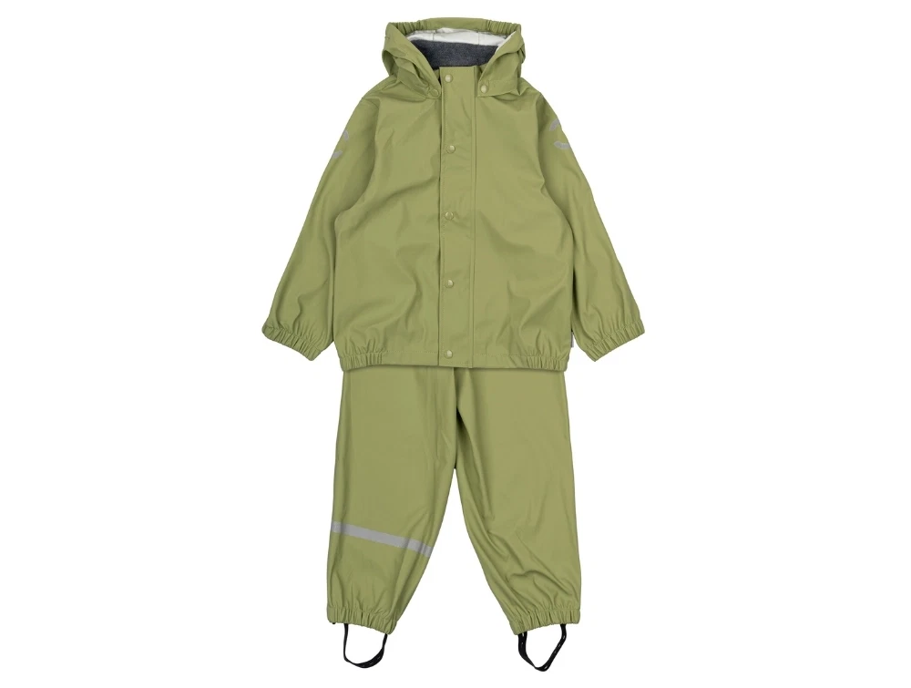 Mikk-Line regnsæt i grøn nuance med refleksdetaljer og aftagelig hætte. Et super fint sæt til regnvejr. Bukserne er uden seler.