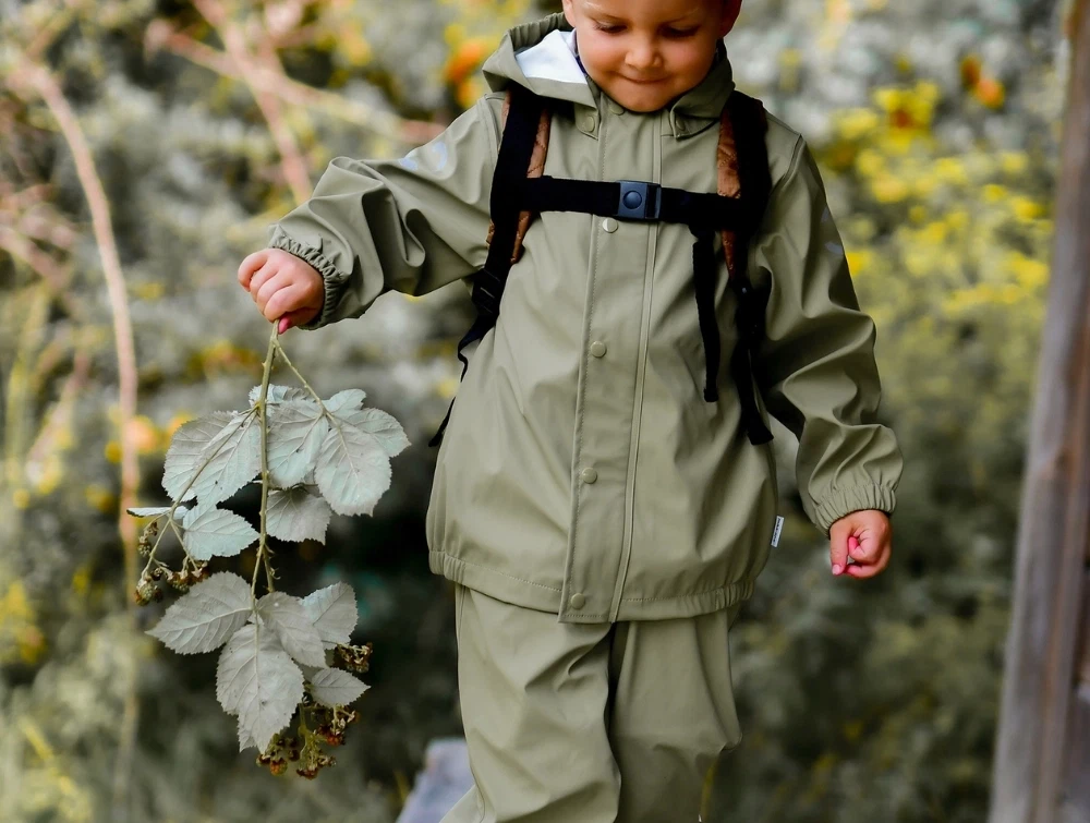 Regnsættet er ideelt til børn, der elsker at udforske naturen i al slags vejr. Sættet har svejsede sømme og et vandtryk på 5.000 mm. Den aftagelige hætte gør det nemt at tilpasse sættet, og de justerbare fodstropper sørger for, at bukserne bliver siddende over gummistøvlerne. Regnsættet har elastikkanter ved hænder og fødder, blødt fleecefor ved halsen og stærke refleksdetaljer, der øger synligheden. Lynlåsen er en YKK-lynlås med praktisk dækflap og hagebeskytter.
