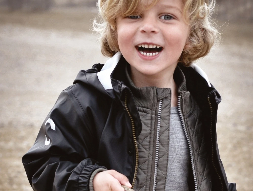 Regnsæt i sort fra Mikk-Line med aftagelig hætte og stærke reflekser. Sættet består af jakke og bukser og er ideelt til våde og blæsende dage i børnehøjde.