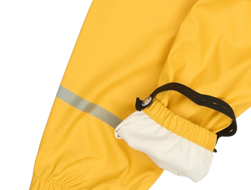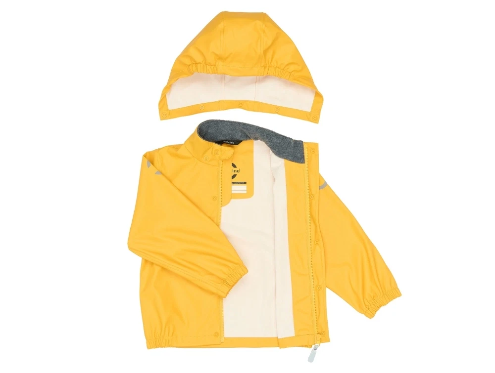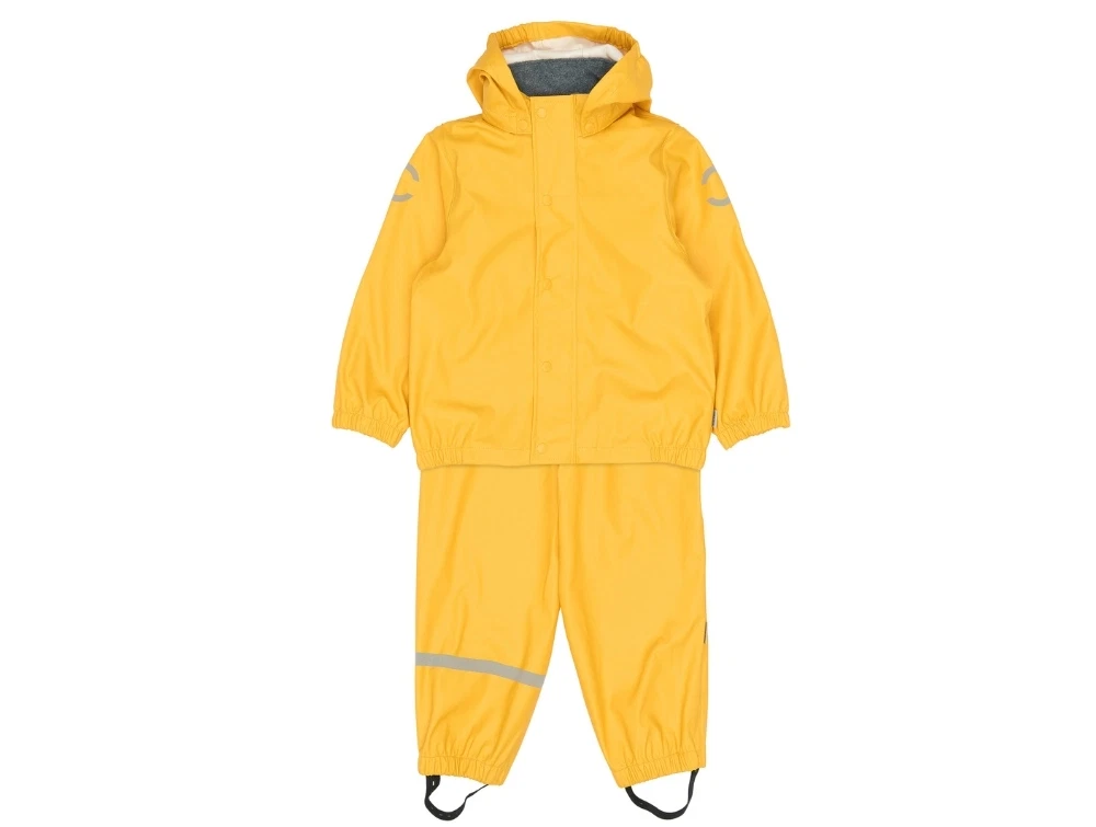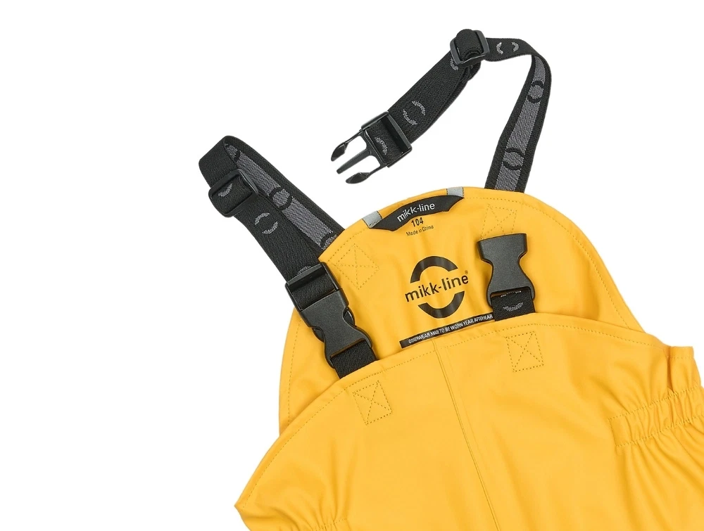 Det gule regnsæt fra Mikk-Line kombinerer synlighed og funktion. Jakken har aftagelig hætte, blødt fleece ved halsen og lukkes med lynlås og trykknapper. Bukserne har brede, justerbare seler med klikspænder samt fodstropper. Begge dele har reflekser og elastik ved åbningerne, så vand og vind holdes ude under leg og bevægelse.