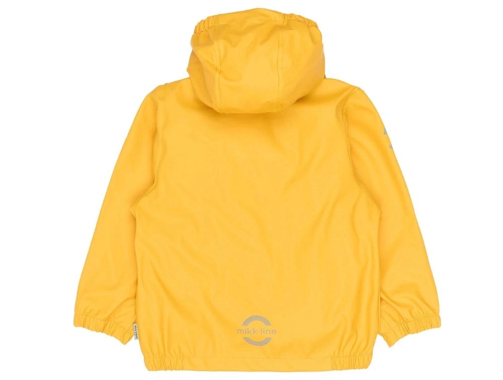 Regnsæt i gul nuance (sunflower) fra Mikk-Line med seler og aftagelig hætte. Sættet består af jakke og bukser i vandtæt PU-materiale med fleece ved kraven.