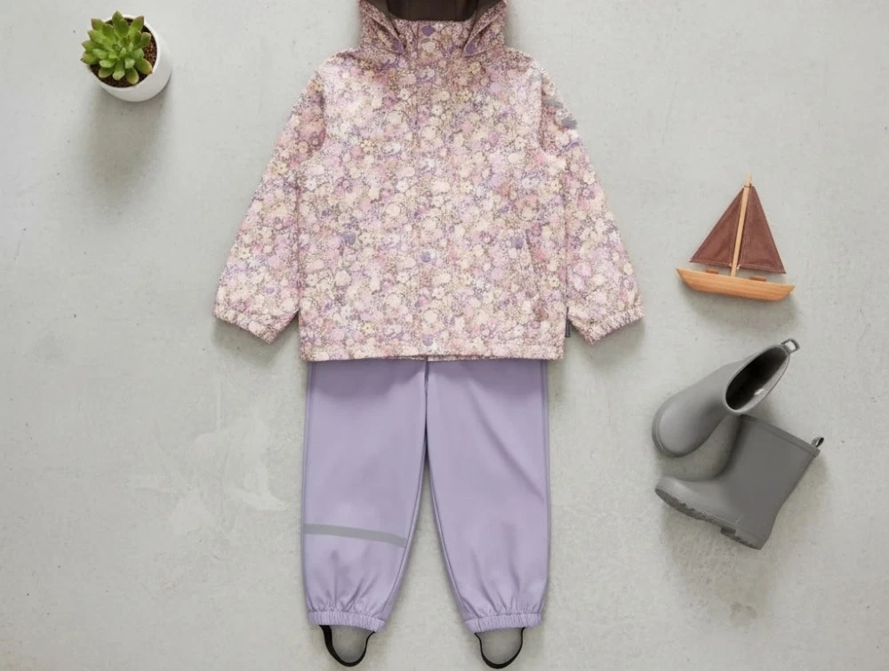 Regnsæt med fin blomstret regnjakke og lilla ensfarvede regnbukser fra Mikk-line.