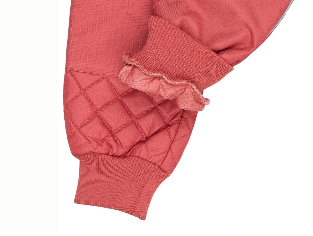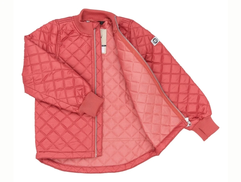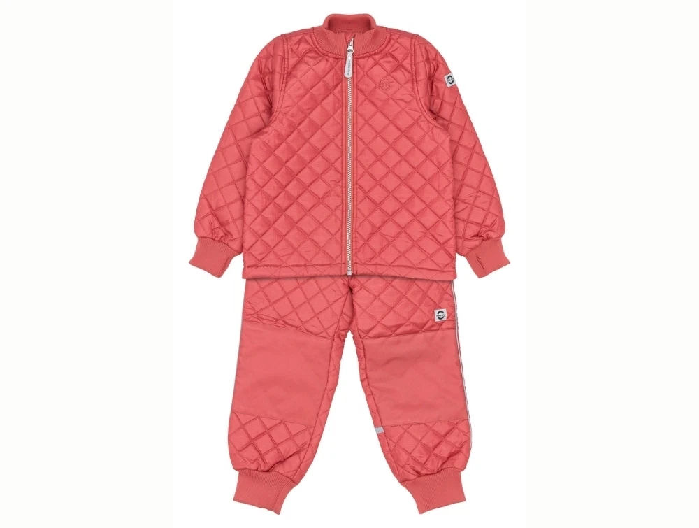Termosæt i rød nuance fra Mikk-line med quiltet overflade og ribkanter, der giver et blødt og praktisk sæt til børn i overgangsvejr.