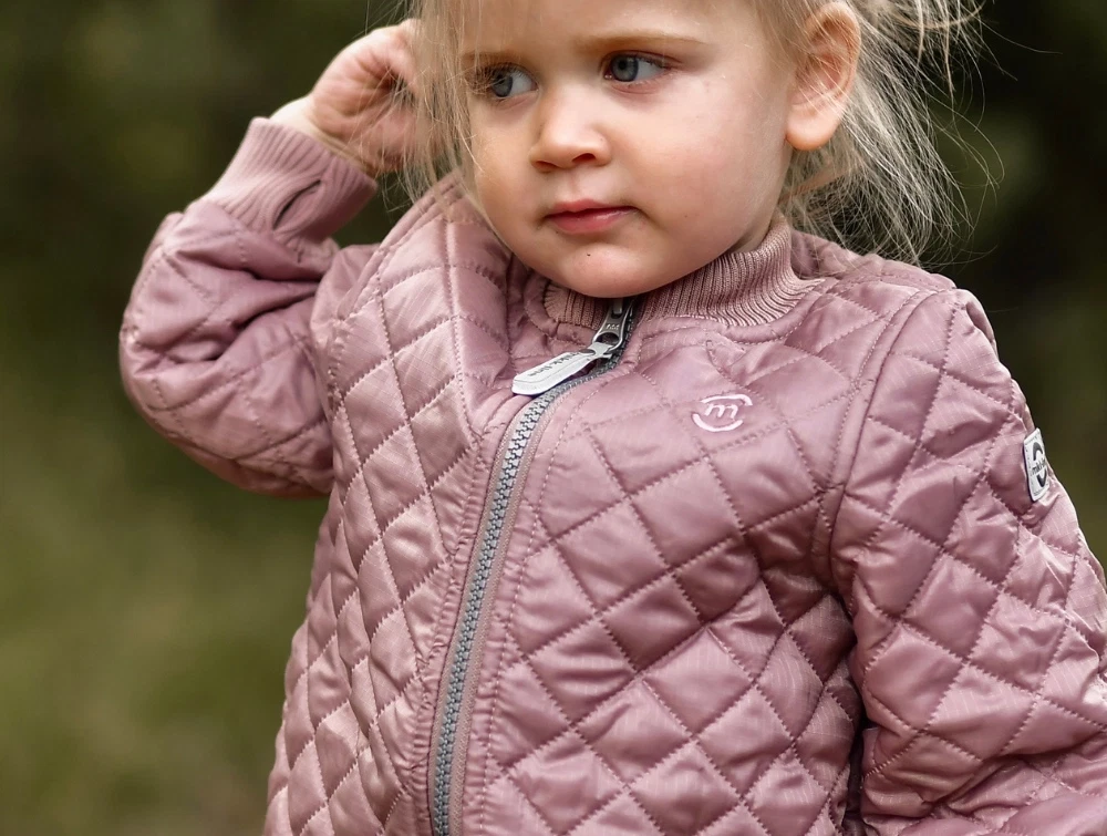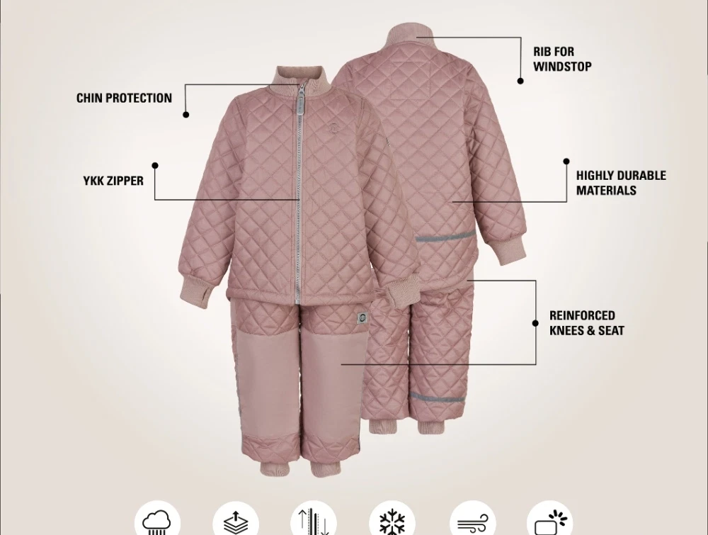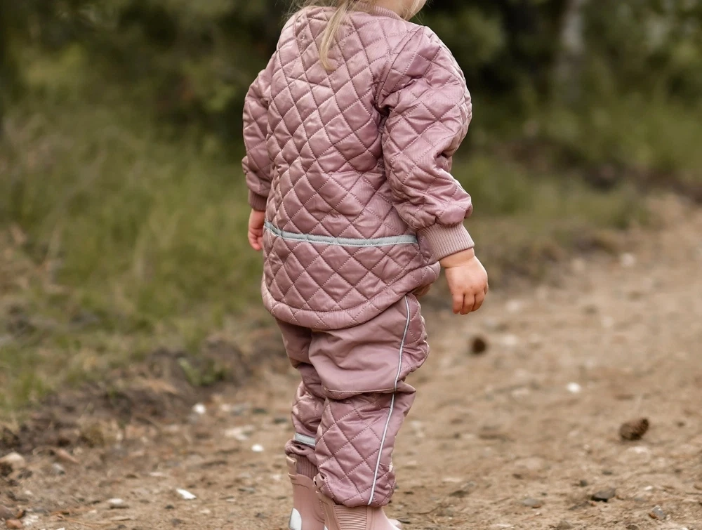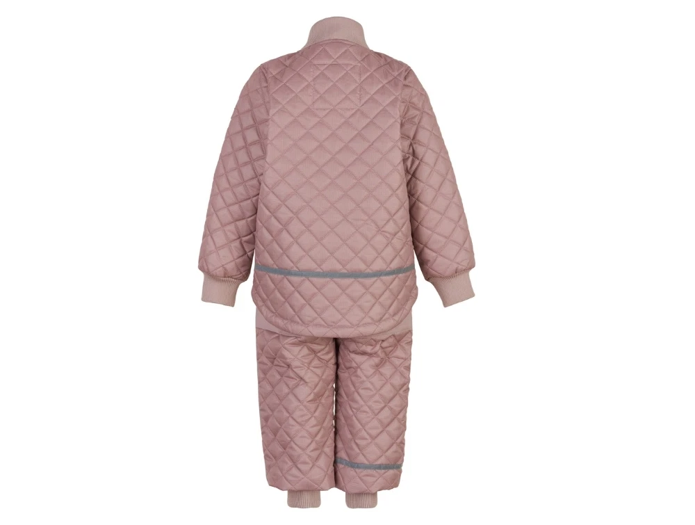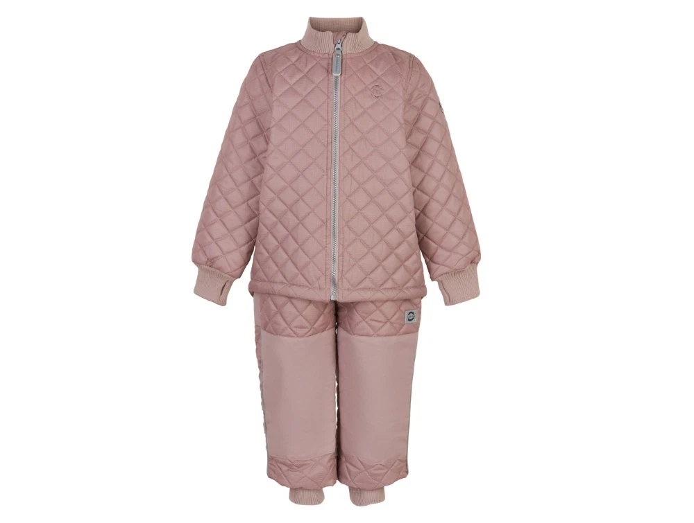 Termosæt i støvet rosa nuance (adobe rose) fra Mikk-Line. Sættet har quiltet overflade, ribkanter og forstærkede felter på knæ og bagdel, hvilket gør det oplagt til brug i overgangssæsonen. Det er både slidstærkt, vindtæt og vandafvisende og passer perfekt til udendørsaktiviteter i køligt vejr.
