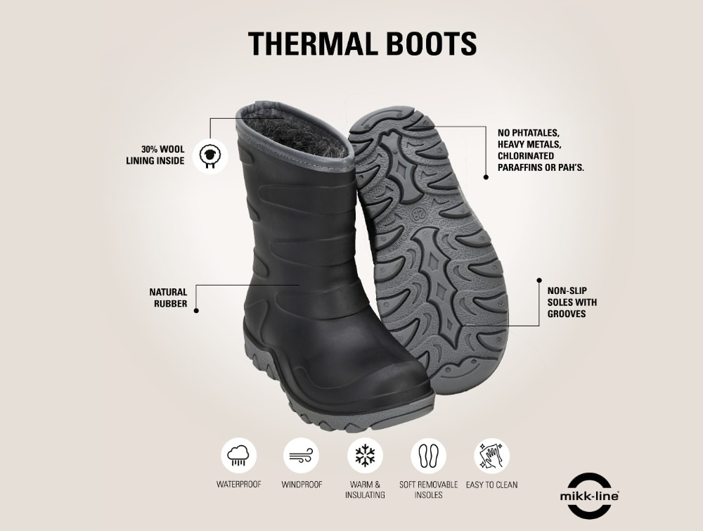 Termostøvle i blå nuance fra Mikk-Line. Støvlerne er udviklet til at give ekstra varme og beskyttelse mod sne, sjap og regn, og hjælper med at holde børns fødder tørre og komfortable i kolde og våde vejrforhold. De er fremstillet i slidstærkt og vandtæt naturgummi og er naturligvis fri for ftalater.