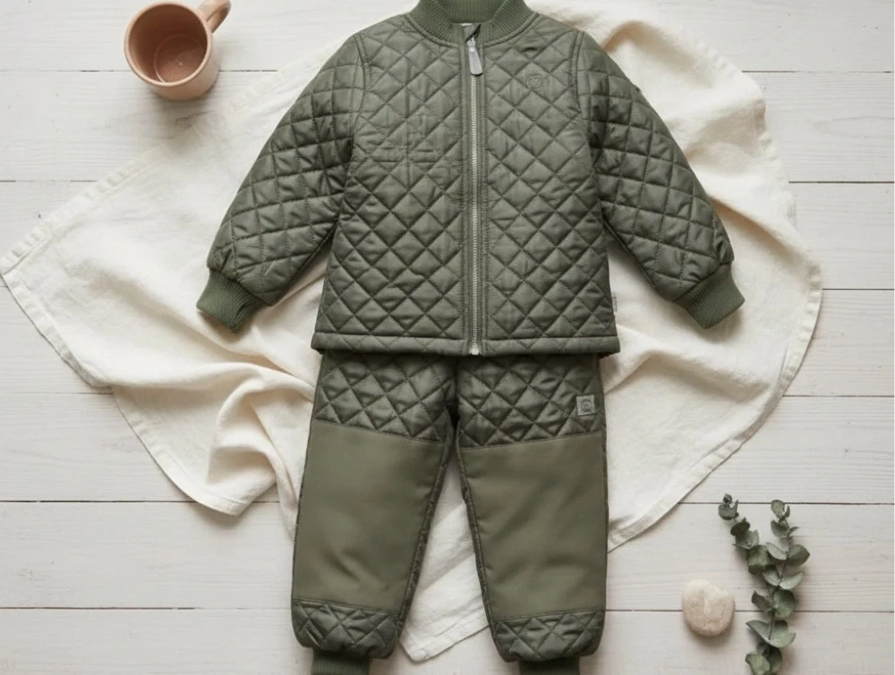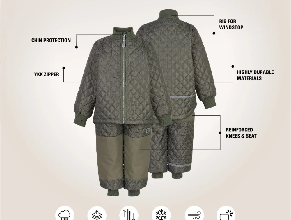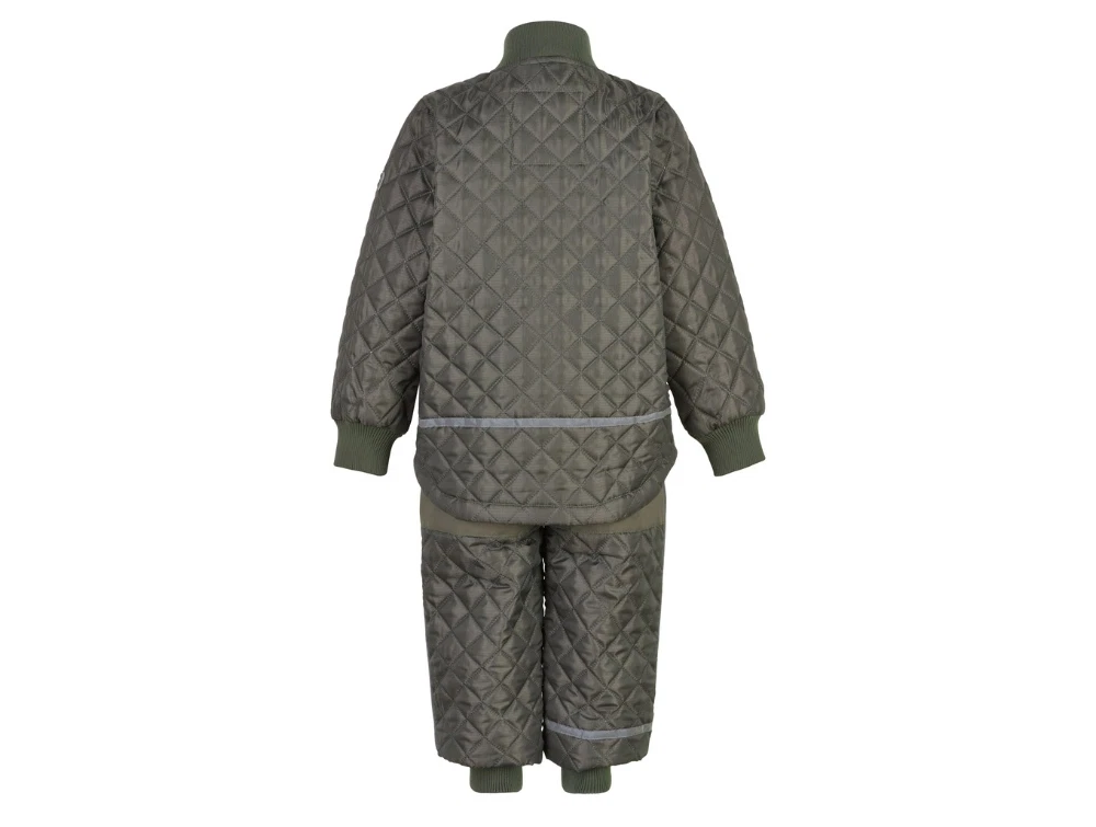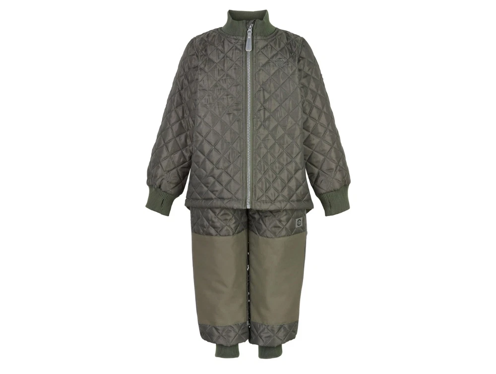 Termosæt i støvet olivengrøn (dusty olive) fra Mikk-Line. Sættet er quiltet, har ribkanter og slidstærke forstærkninger på knæ og sæde, hvilket gør det oplagt til udendørsaktiviteter i overgangsperioder. Det er vindtæt og vandafvisende og har en unisex pasform, som gør det nemt at give videre.