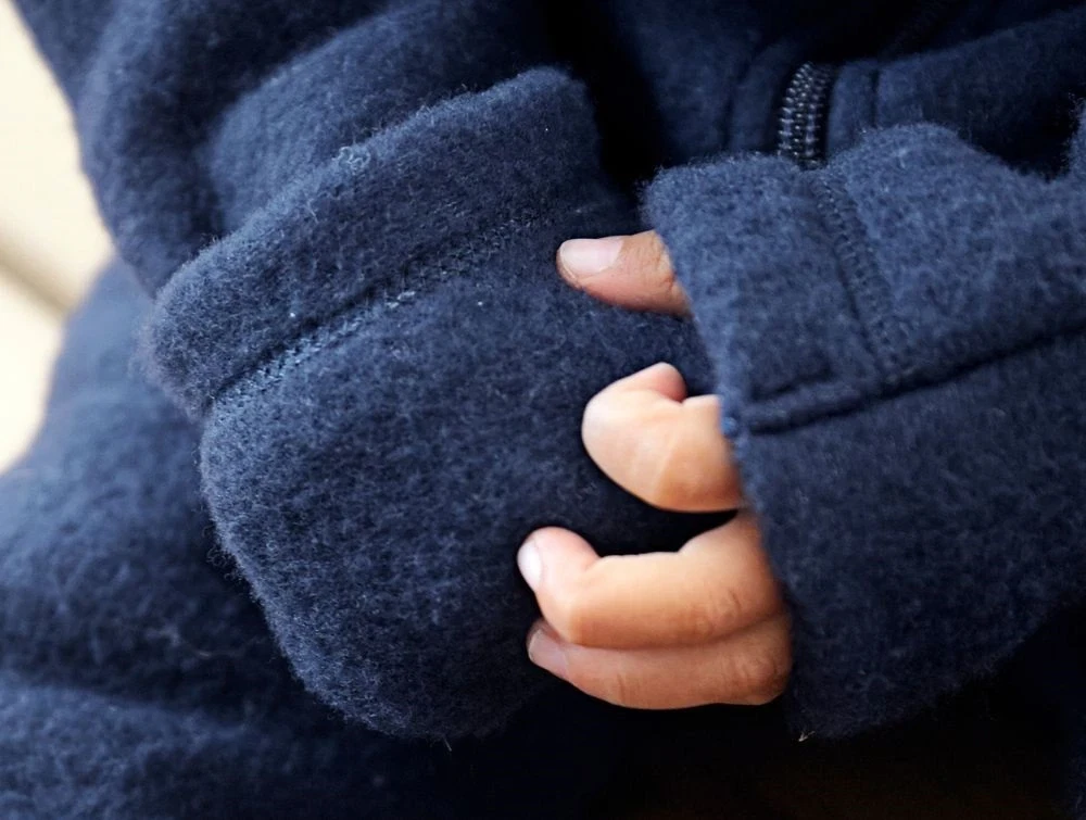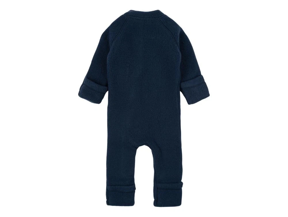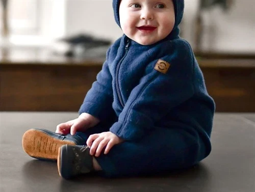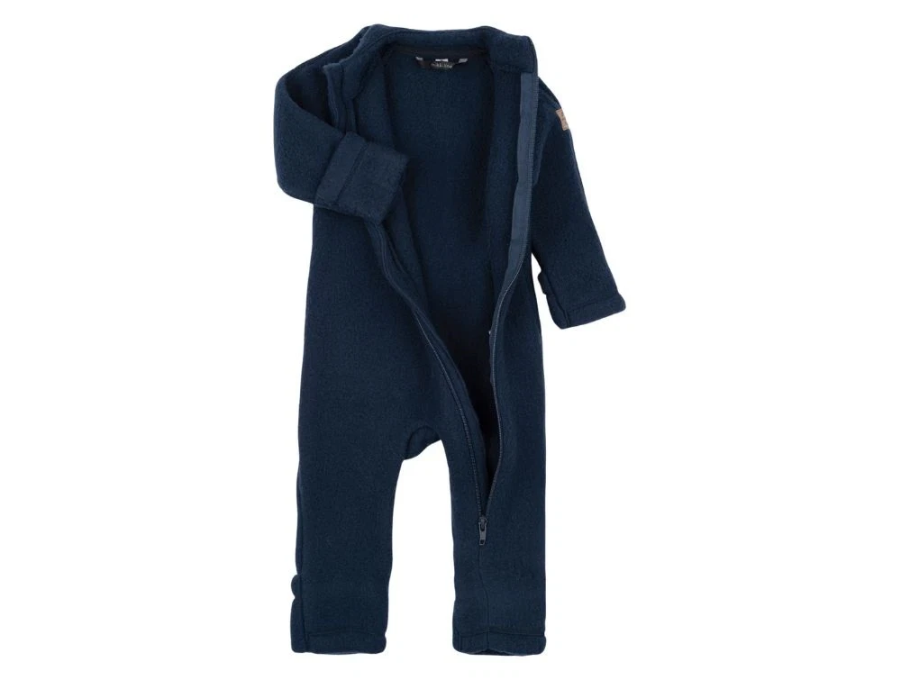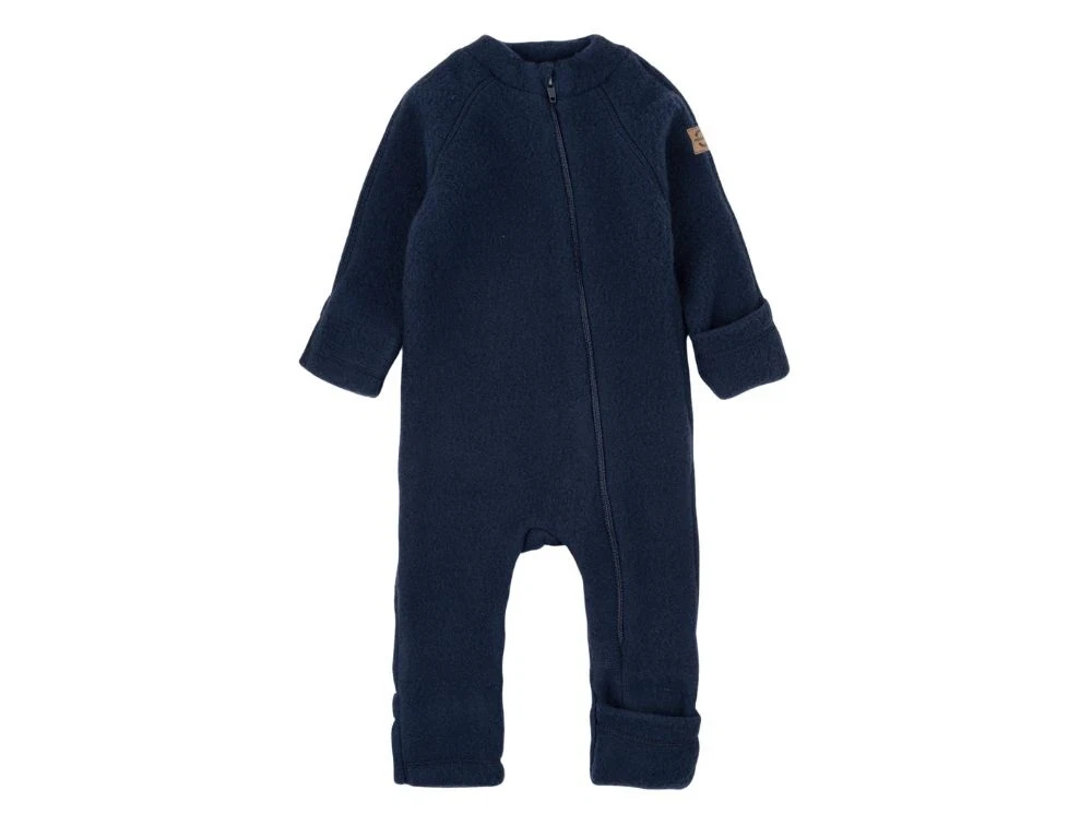 Ulddragt i børstet merinould farven blue nights fra Mikk-line. Dragten har en lang, nikkelfri YKK-lynlås med hagebeskyttelse og vendbare manchetter, der ved ombuk kan dække hænder og fødder for ekstra varme. Certificeret efter OEKO-TEX® Standard 100, hvilket sikrer, at den er uden skadelige kemikalier. God som både yderlag eller mellemlag alt efter vejret.