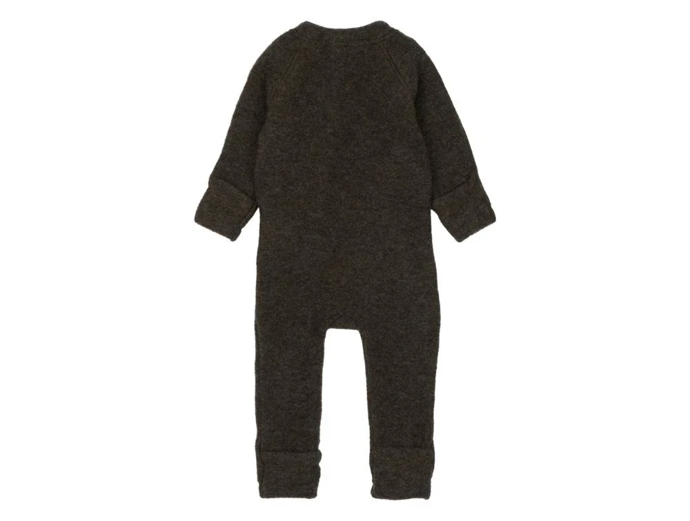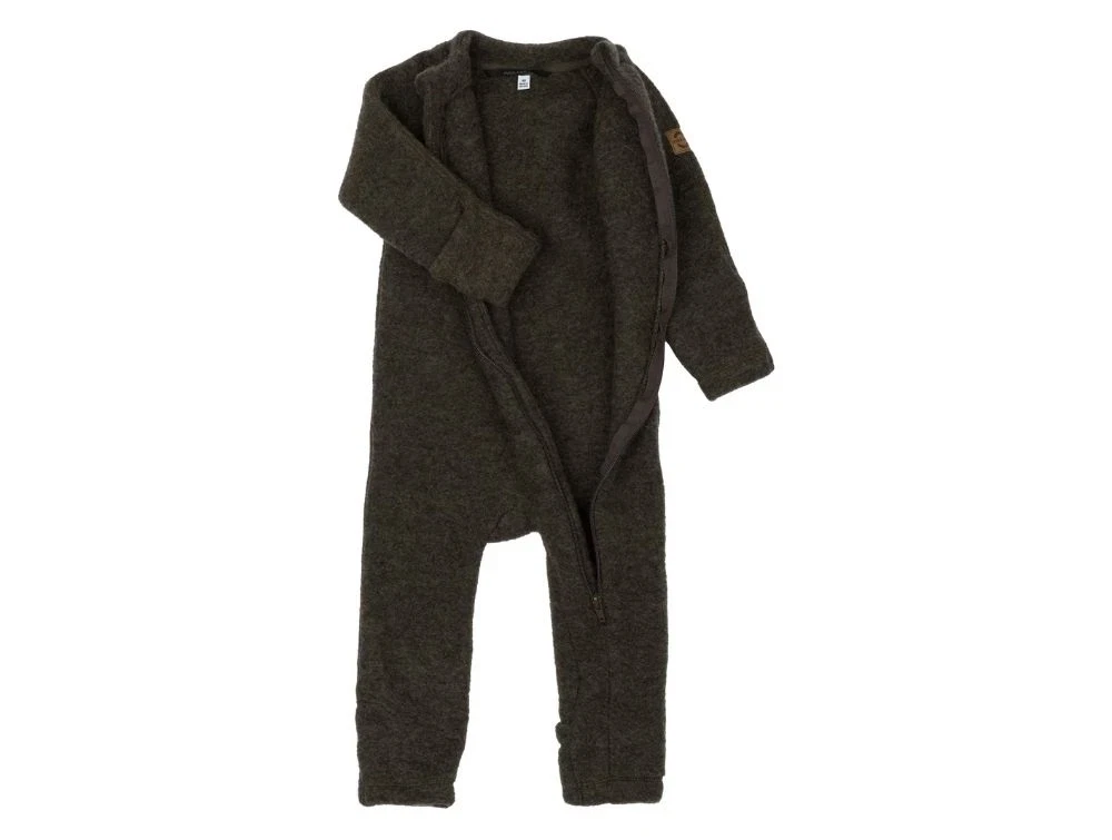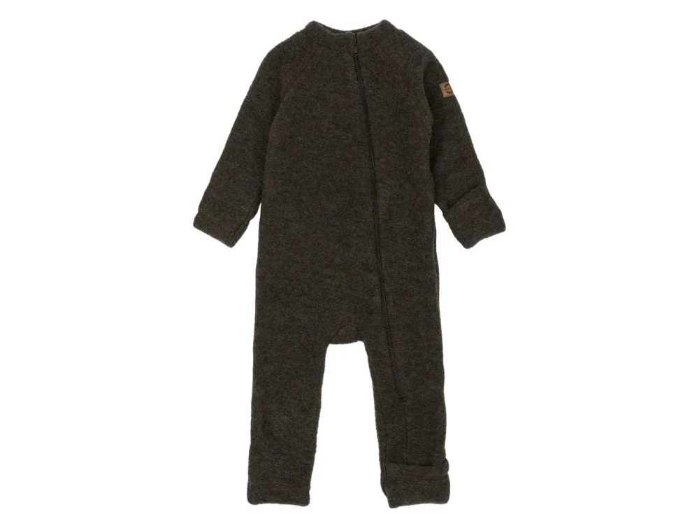 Mikk-Line ulddragt i mørkebrun meleret nuance (dark brown melange) lavet i blød merinould uden mulesing. Dragten har en lang YKK-lynlås og praktiske vendbare ærme- og benkanter, som kan lukkes om hænder og fødder.