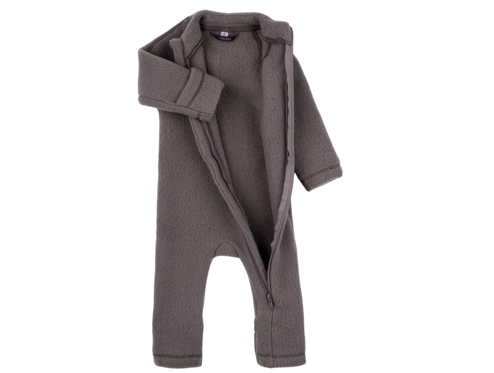 Mikk-Line ulddragt i gråbrun nuance med lilla toner (sparrow) lavet i blød merinould uden mulesing. Dragten har en lang YKK-lynlås og praktiske vendbare ærme- og benkanter, som kan foldes over hænder og fødder.