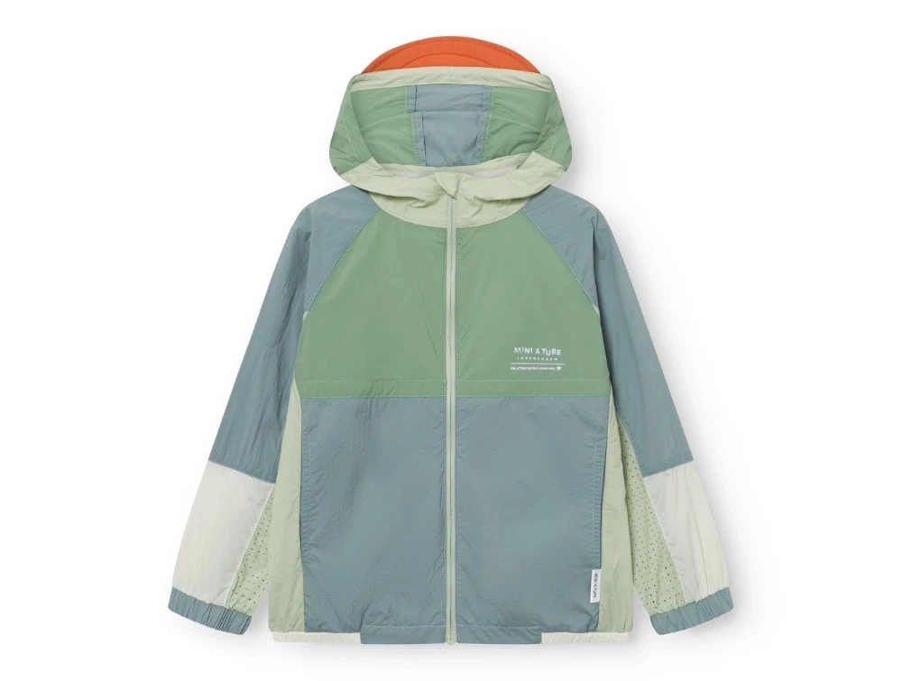 Jakken er fremstillet i et let materiale med UV40-beskyttelse, som hjælper med at beskytte barnets hud mod solens stråler. Hætten har en lille skyggekant foran for ekstra beskyttelse, og bagpå er der en åbning, som giver plads til hestehale eller opsat hår. Foran har jakken skrå lommer og et diskret Mini A Ture-reflekslogo.