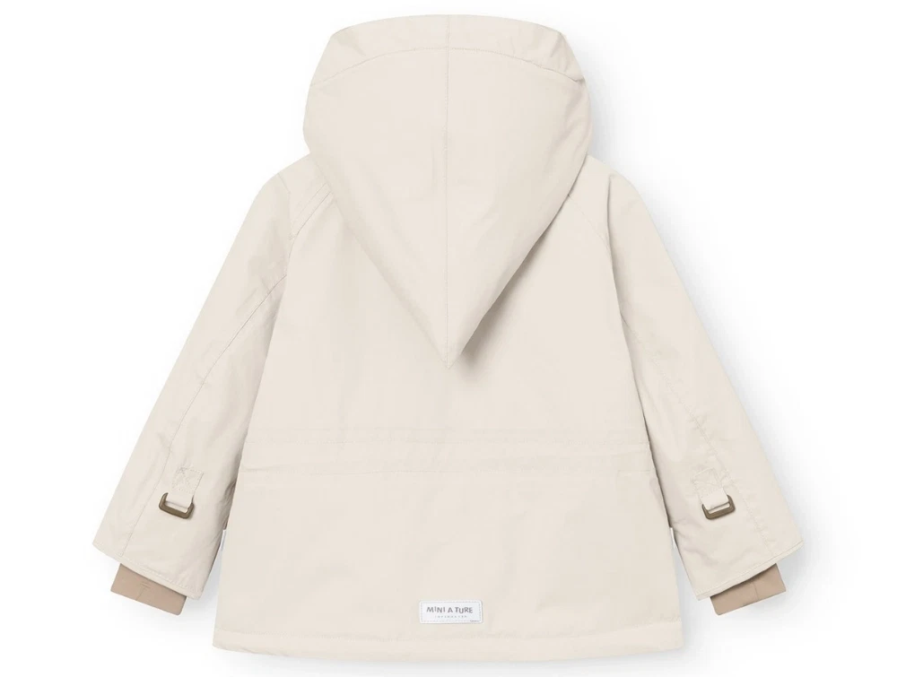 Vinterjakke i råhvid nuance (angora cream) fra Mini A Ture med blødt fleecefoer og aftagelig hætte.