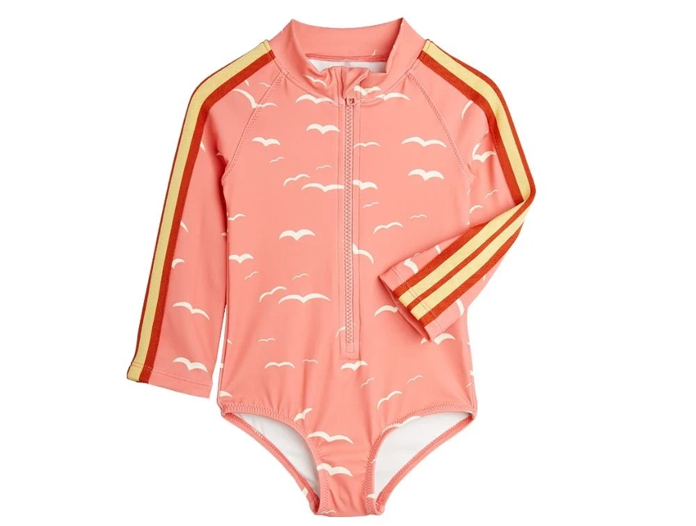 Mini Rodini badedragt med lange ærmer i pink med mågeprint.