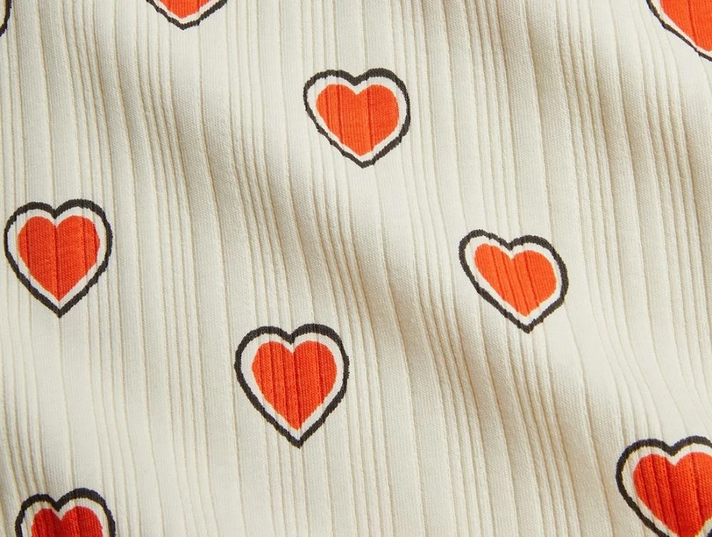 Bukserne har en pasform med svaj og et sødt all-over print med røde hjerter. De er lavet i en blød og strækbar ribkvalitet af GOTS-certificeret økologisk bomuld med elastan, som giver god bevægelighed og komfort. Modellen har en elastik i taljen for en behagelig pasform.