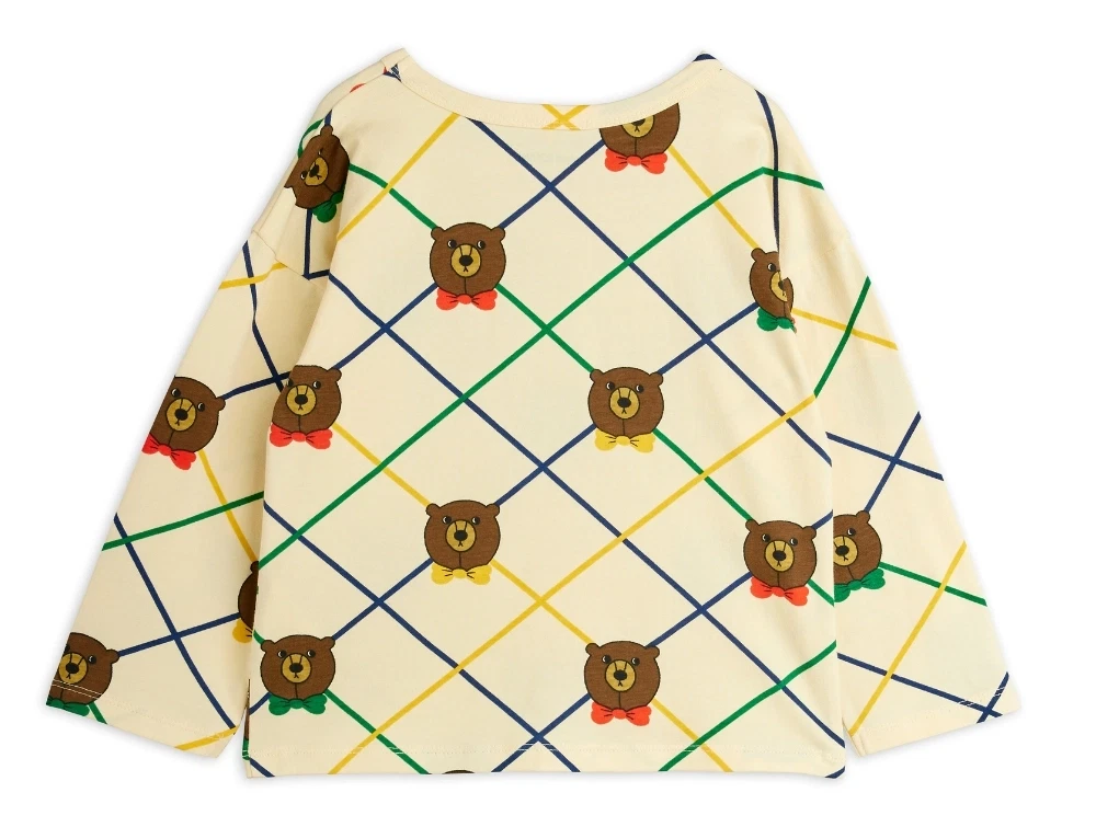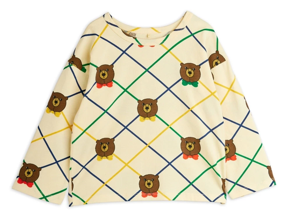 Langærmet T-shirt i råhvid fra Mini Rodini med ternemønster og bjørne med farvede sløjfer.