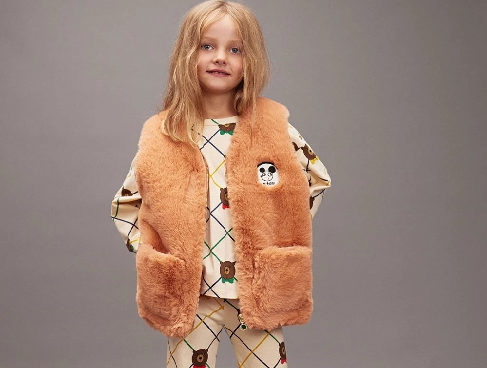 Mini Rodini langærmet T-shirt råhvid med bjørneprintBarn med Mini Rodini T-shirt med farvet ternemønster og bjørneNærbillede af bjørneprint på Mini Rodini T-shirtMini Rodini T-shirt bagfra med tern og print
