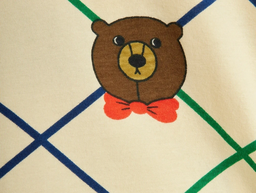 Printet med bjørne og tern dækker hele stoffet og giver et legende og farverigt udtryk.
