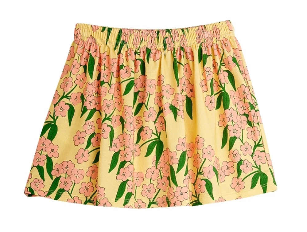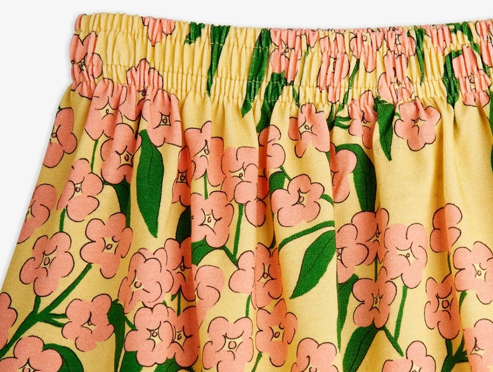 Nederdel i gul nuance med all-over blomsterprint fra Mini Rodini. Printet forestiller alpine flowers i rosa og grønne nuancer.