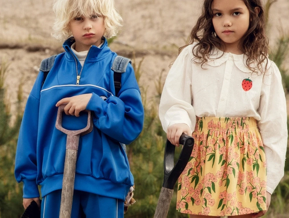 Nederdel fra Mini Rodini med alpine flowers-print set forfraBarn iført nederdel fra Mini Rodini med alpine flowers-print  Nederdel fra Mini Rodini med alpine flowers-print set bagfra Nærbillede af elastik og blomsterprint på nederdel fra Mini Rodini