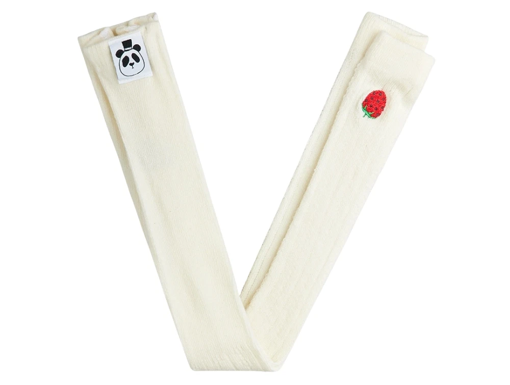 Pointelle leggings i hvid nuance fra Mini Rodini med broderet jordbær og panda-logo.