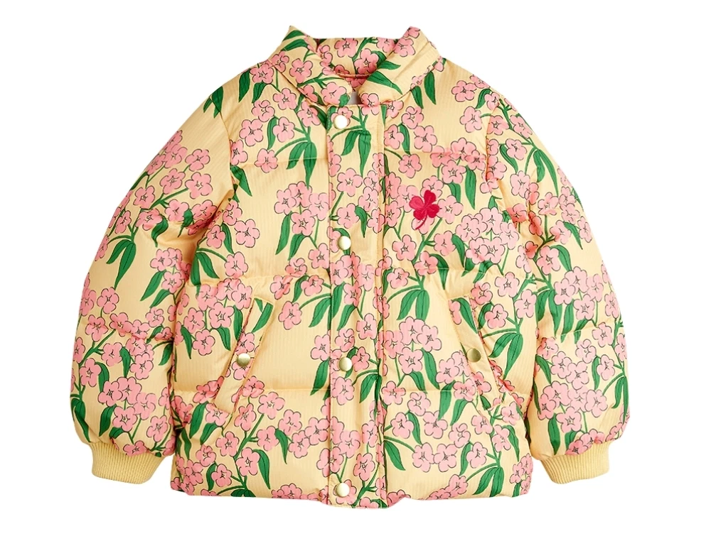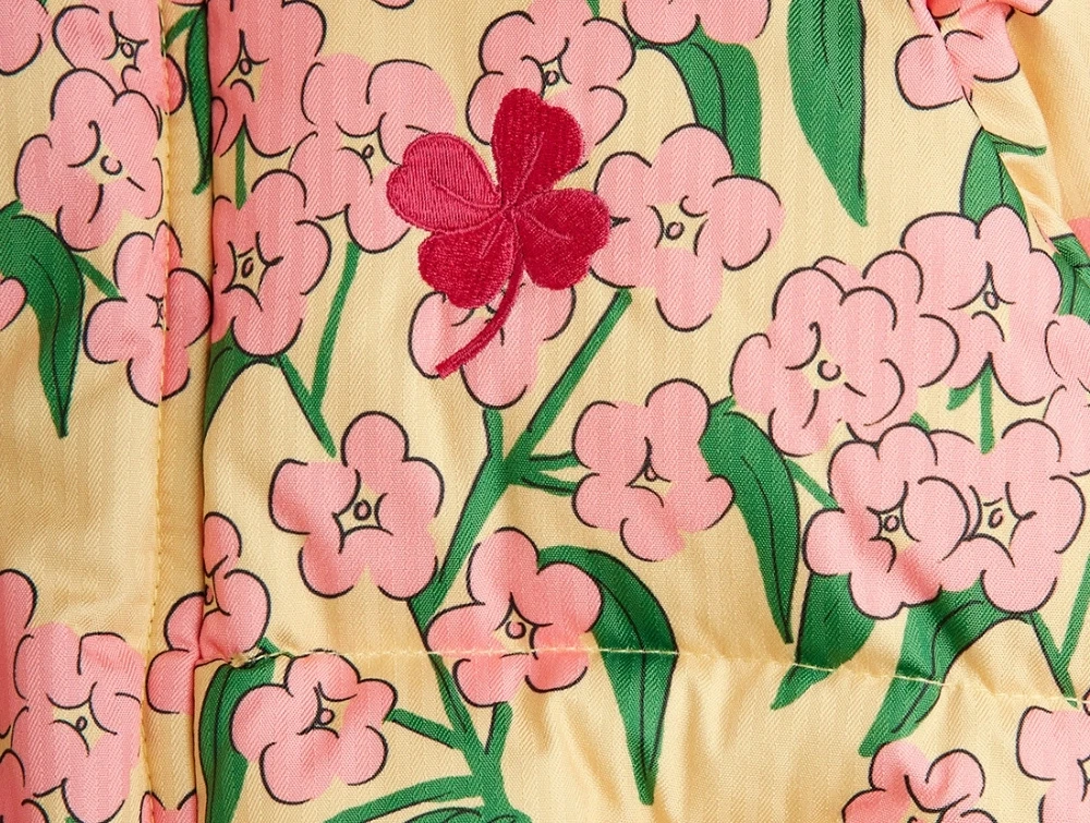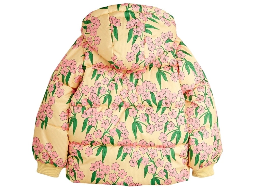 Pufferjakke i gul nuance med rosa blomsterprint fra Mini Rodini.
