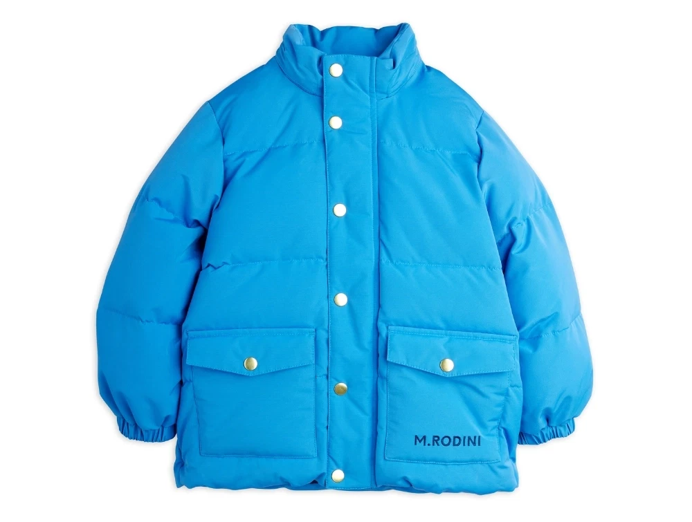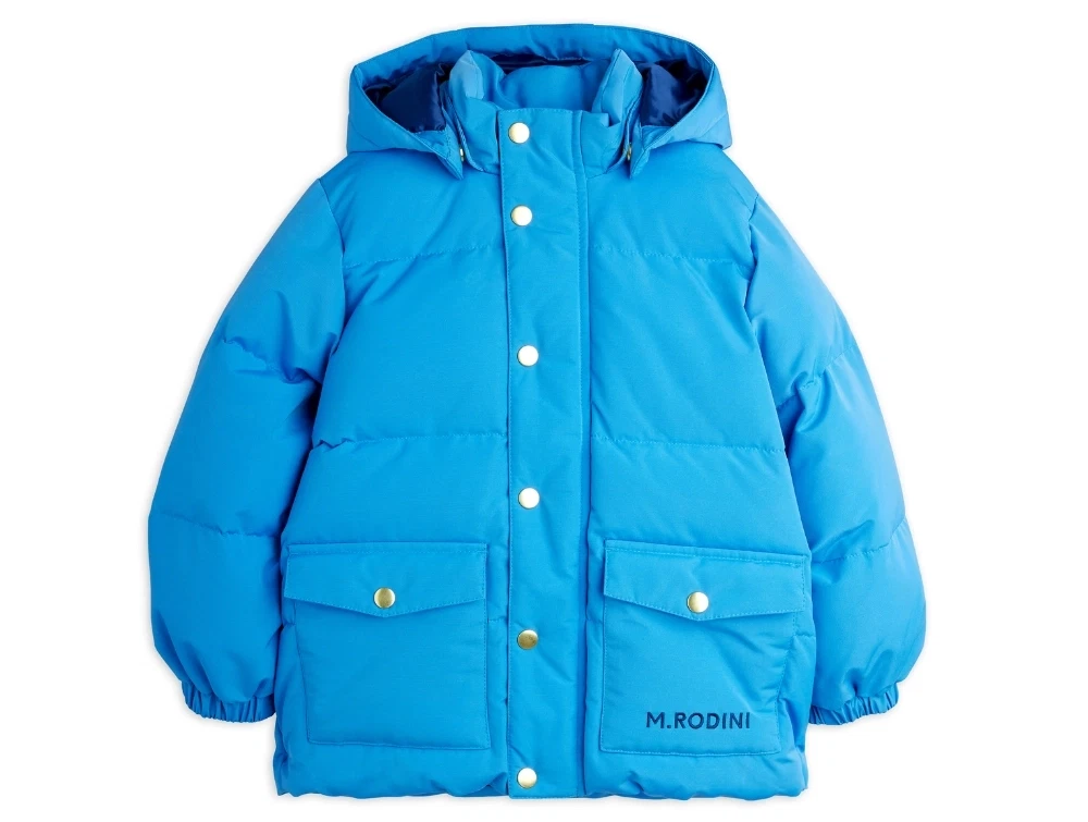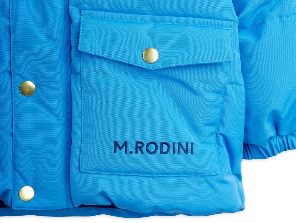 Mini Rodini blå pufferjakke set forfra med hættebarn iført Mini Rodini blå pufferjakke med hætteMini Rodini blå pufferjakke uden hættebroderet M.Rodini logo og lomme på blå pufferjakkeMini Rodini blå pufferjakke set bagfra med hætte
