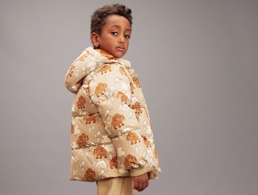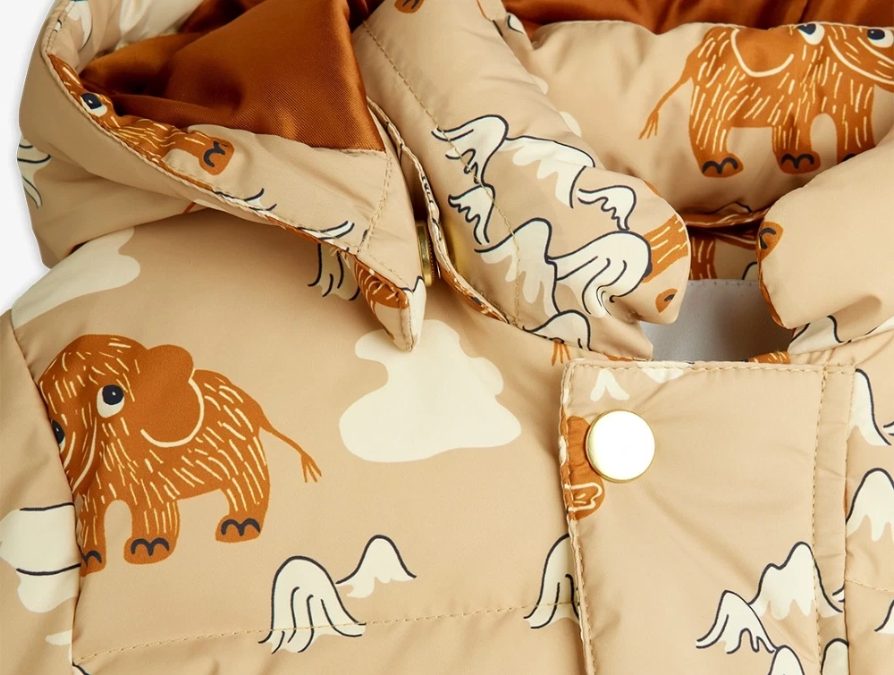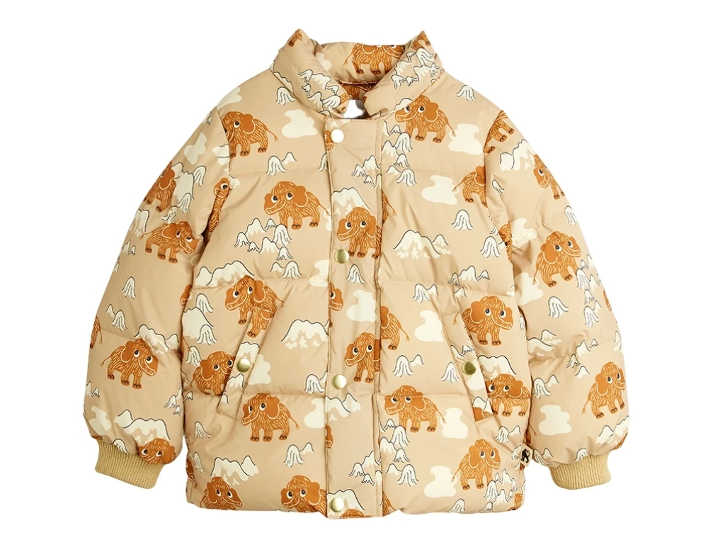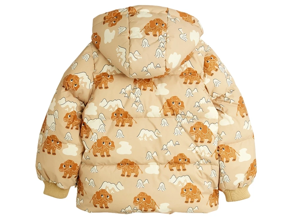 Varm pufferjakke i beige nuance med all-over mammut-print fra Mini Rodini.