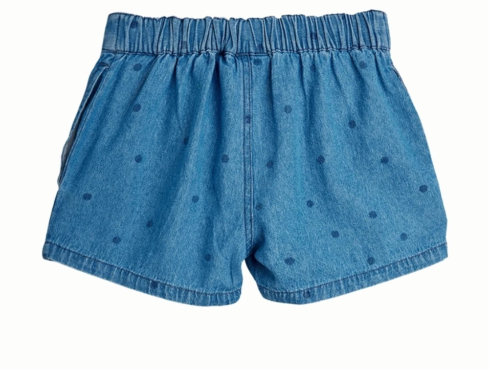 Mini Rodini shorts i blue med prikprint set forfraPige iklædt Mini Rodini shorts i blue med prikprintMini Rodini shorts i blue med prikprint detalje af stofMini Rodini shorts i blue med prikprint set bagfra