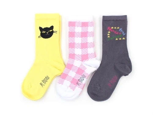 3 par forskelligfarvede strømper med mønster og motiver fra Mini Rodini.