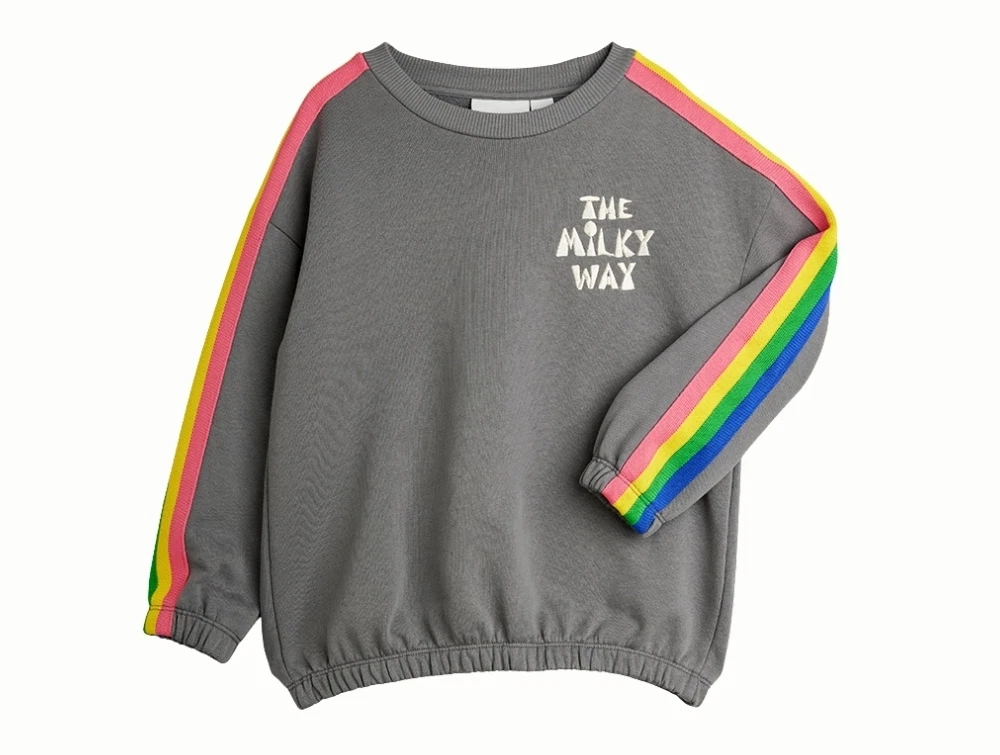 Sweatshirt i grå fra Mini Rodini med farverige regnbuefarvede paneler langs skuldre og ærmer samt The Milky Way print på brystet.