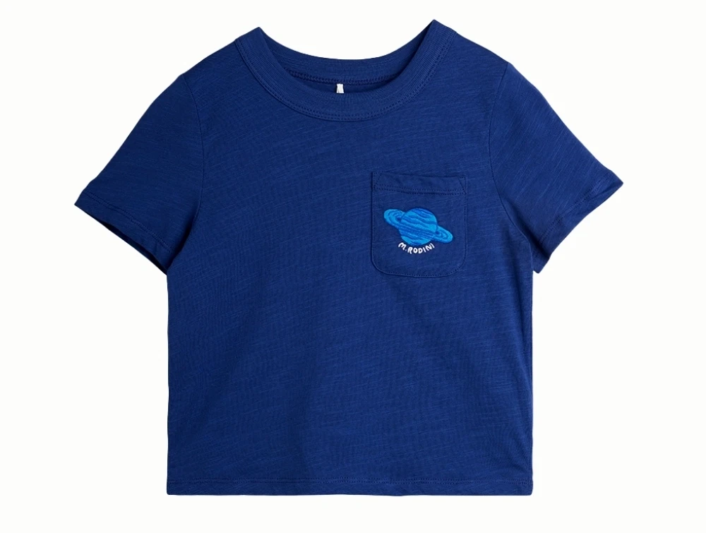 Kortærmet T-shirt i blå fra Mini Rodini med lille planetbroderi på brystlommen.