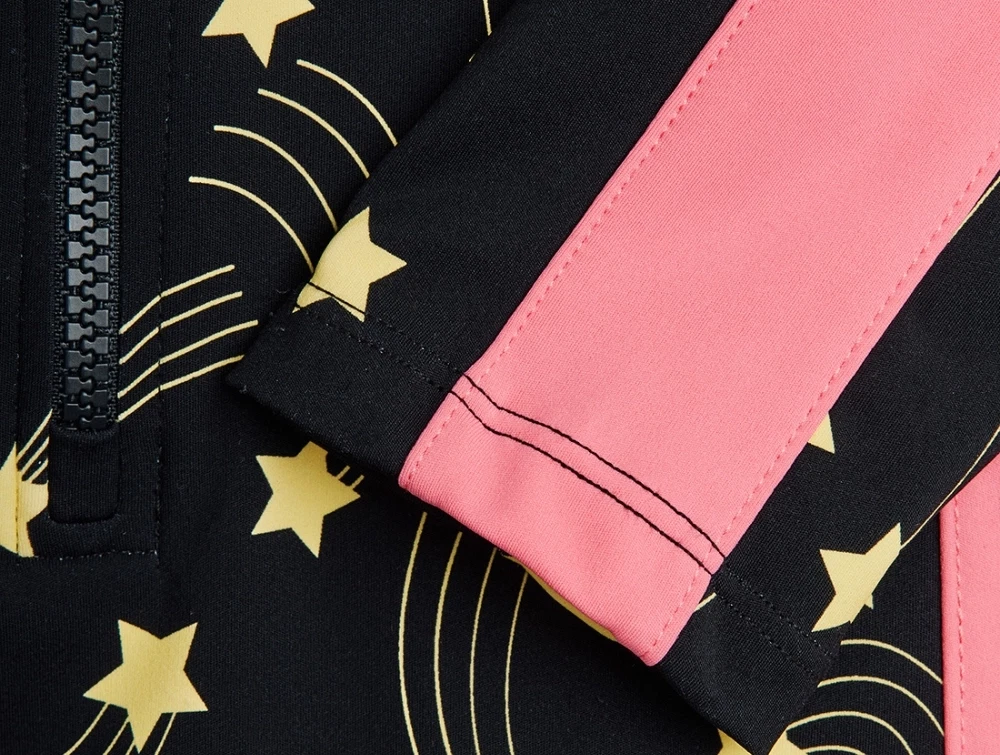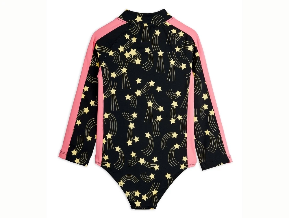 Langærmet badedragt i sort nuance fra Mini Rodini med all-over stjerneskud print og kontrastfarvede paneler langs ærmerne.